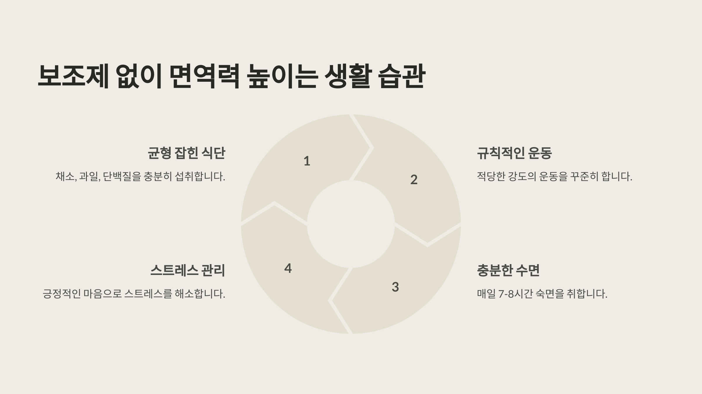 건강보조제가 도움이 될 수 있지만, 면역력을 근본적으로 강화하는 가장 좋은 방법은 건강한 생활 습관을 유지하는 것이에요. 올바른 식습관, 규칙적인 운동, 충분한 수면만으로도 면역력을 자연스럽게 높일 수 있어요.