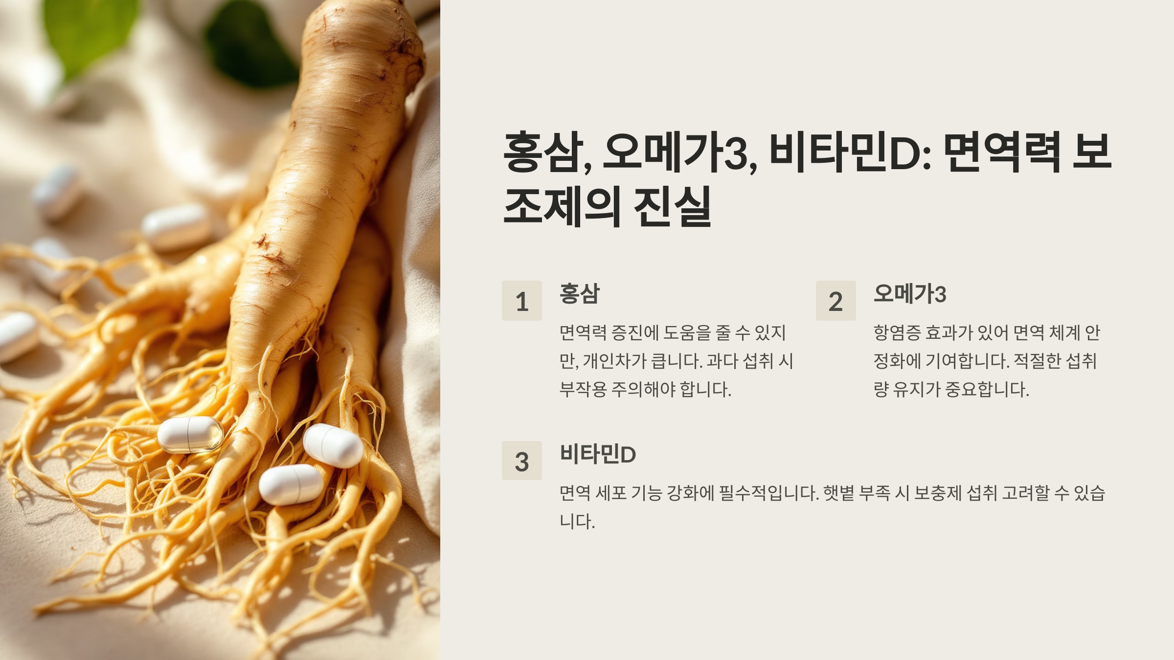 면역력 보조제 중에서 가장 많이 언급되는 것이 홍삼, 오메가3, 비타민D예요. 각각의 성분이 면역 체계에 어떤 영향을 미치는지 살펴볼게요.