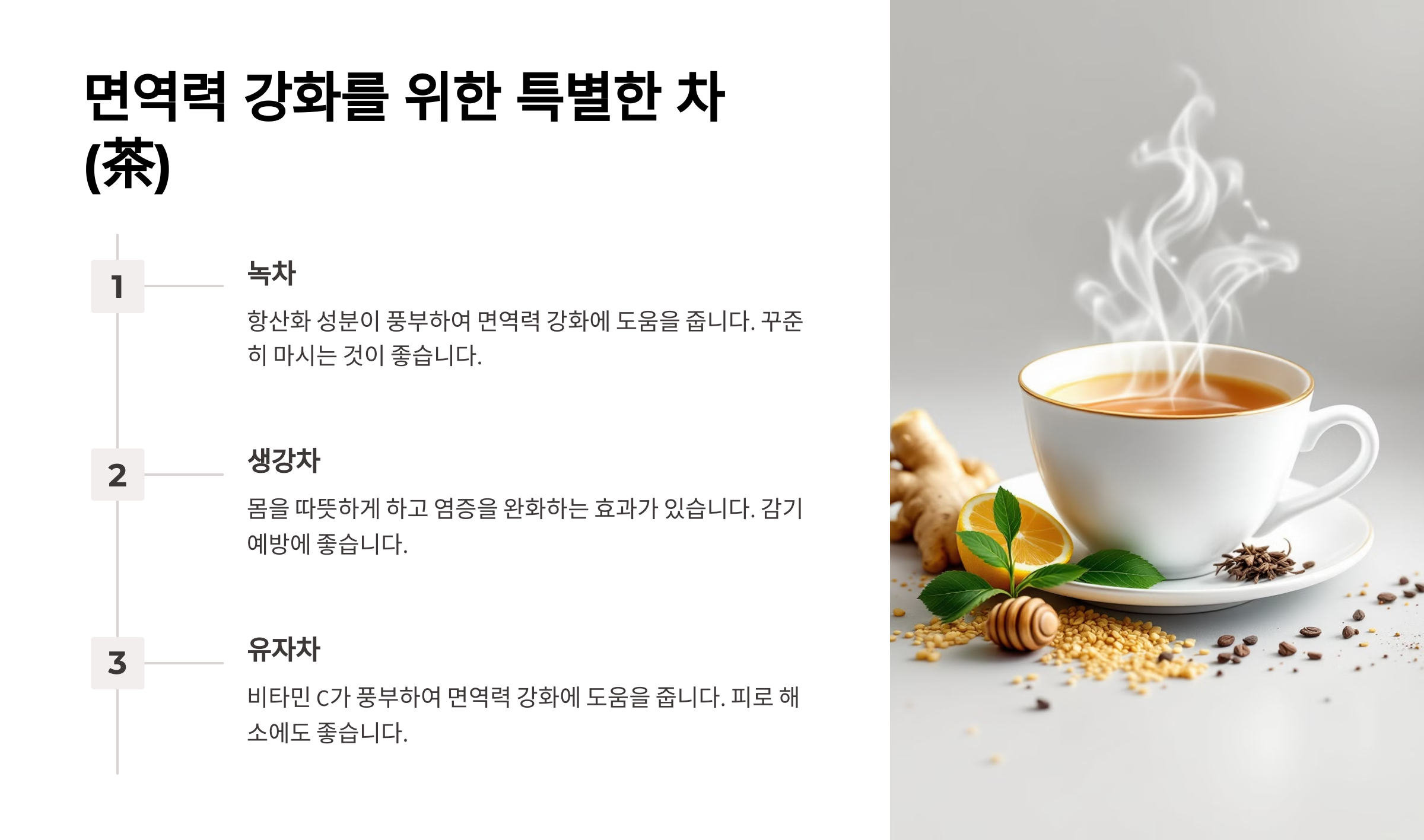 차(Tea)는 면역력 강화에 도움이 되는 대표적인 음료예요. 특히, 항산화 효과가 있는 차를 마시면 면역 체계를 튼튼하게 만들 수 있어요.