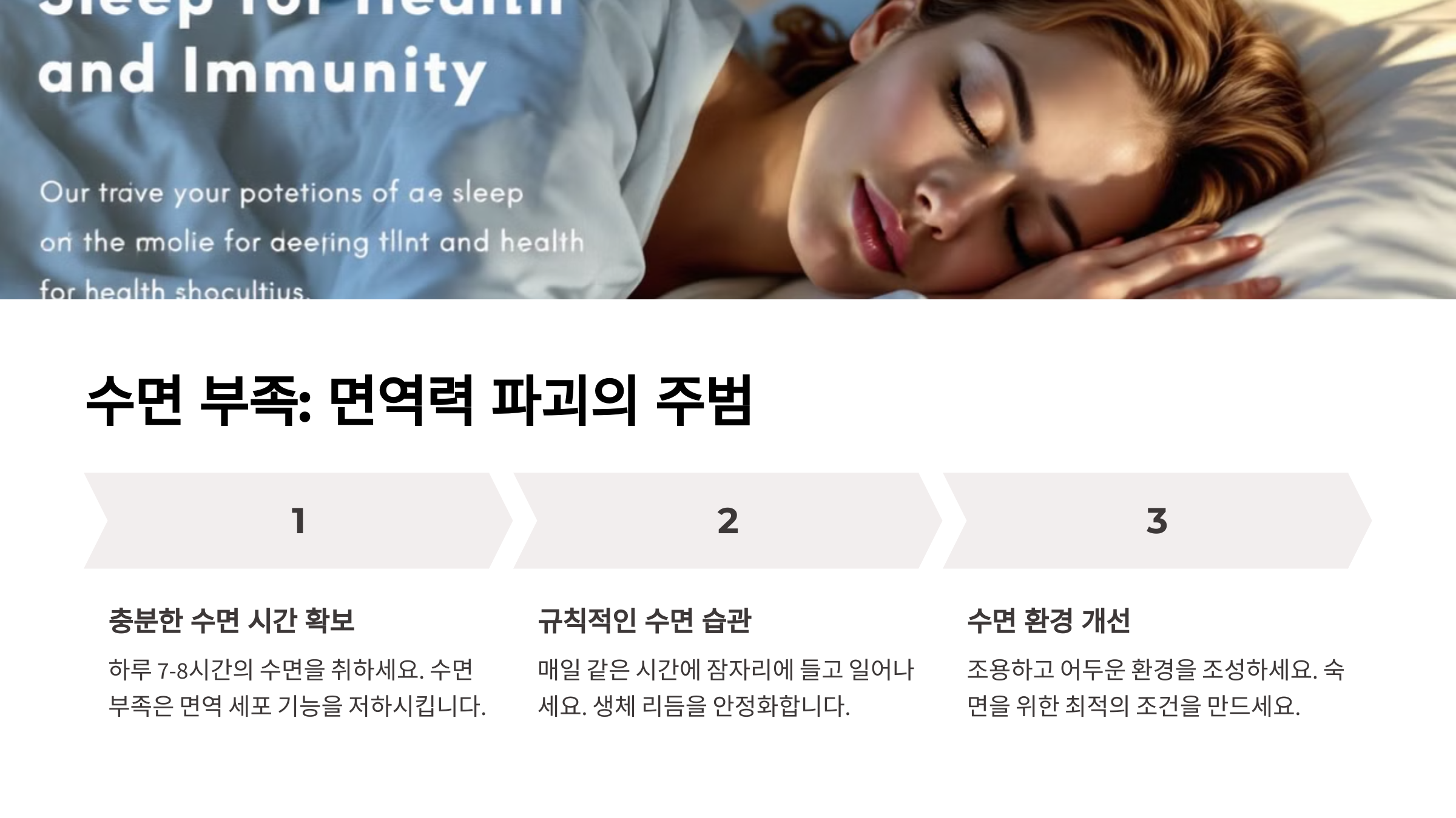 수면이 부족하면 면역력이 급격히 떨어져요. 밤에 잠을 자는 동안 우리 몸은 면역 세포를 활성화하고, 손상된 조직을 복구하는 시간을 가져요.