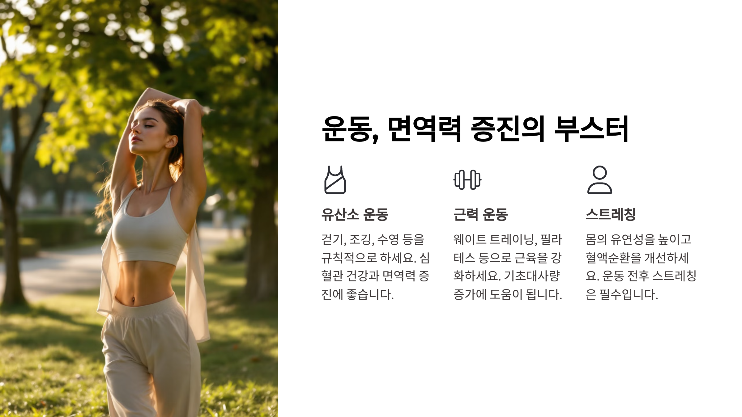 운동 후에는 충분한 수분 섭취와 휴식을 통해 몸의 회복을 도와야 해요. 꾸준한 운동 습관이 면역력 증진에 효과적이에요.
