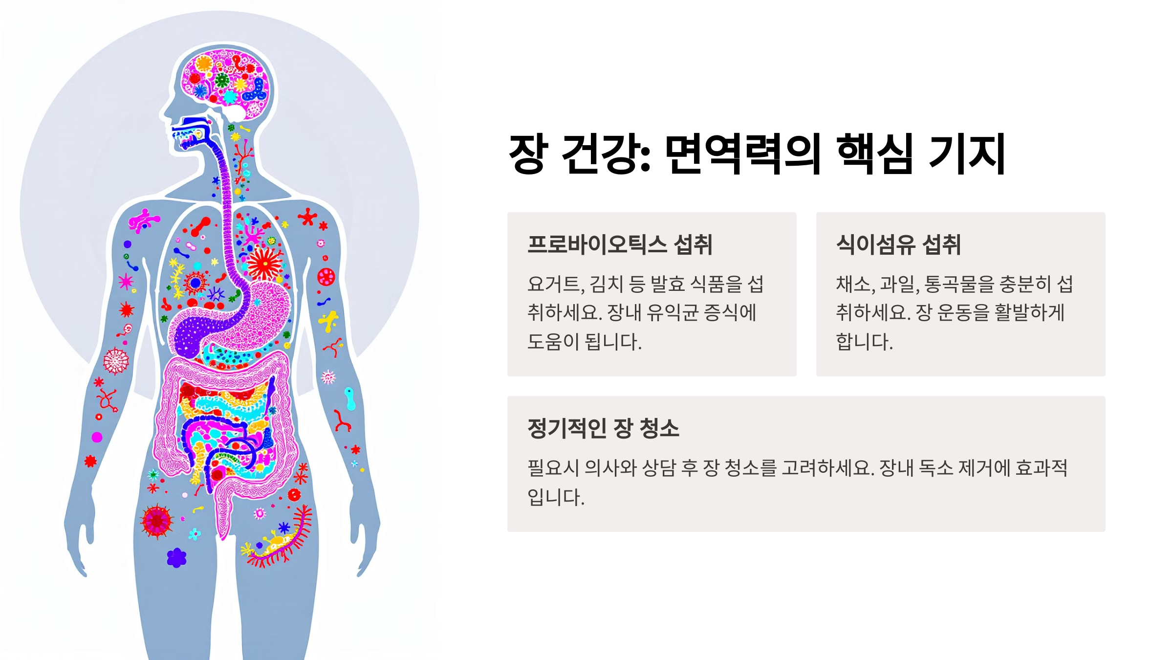 장 건강이 좋아야 면역력이 올라가요. 요구르트나 김치 같은 발효식품을 섭취하면 장내 유익균이 증가해요.