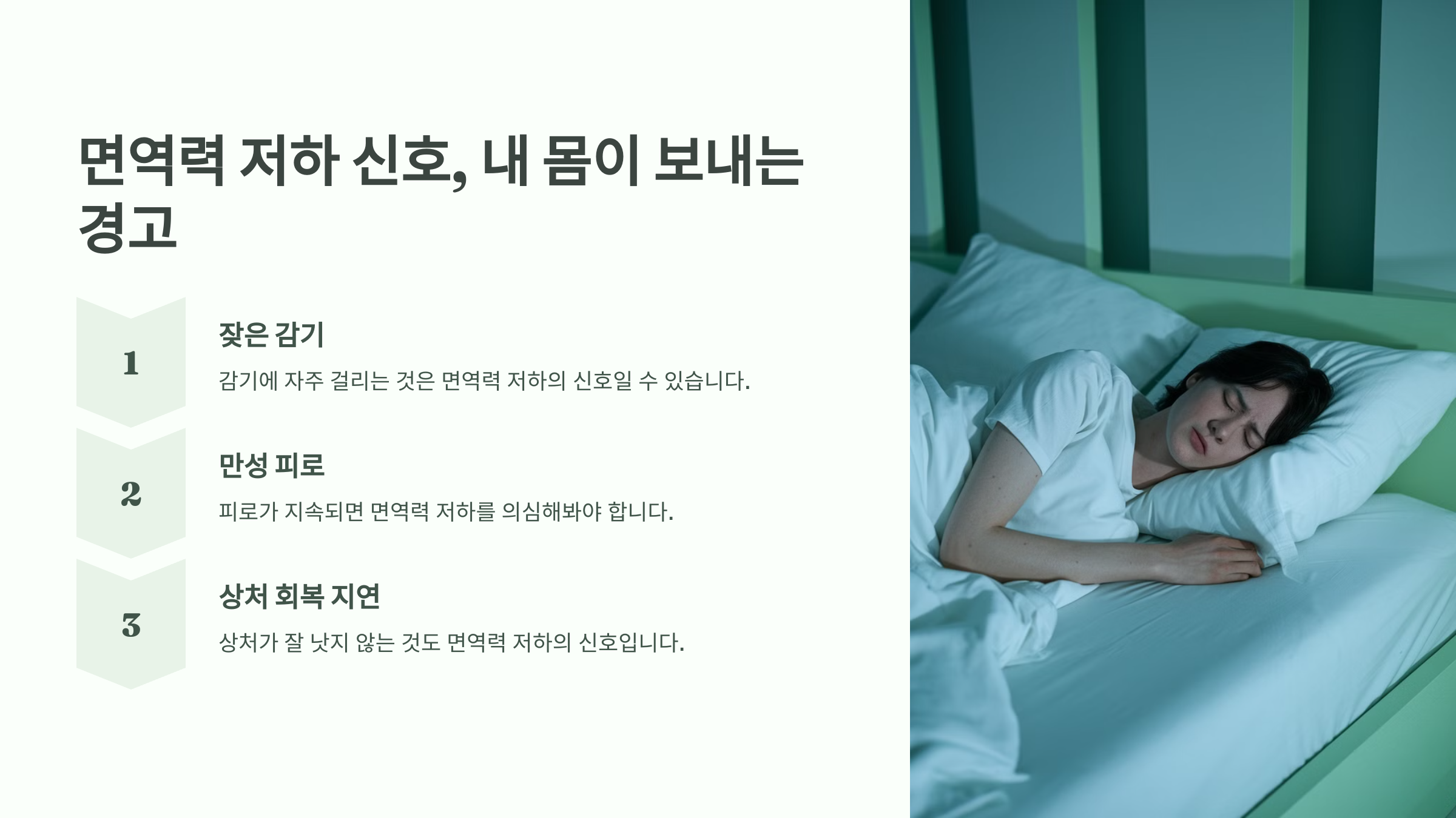 우리 몸은 면역력이 떨어지면 다양한 신호를 보내요. 하지만 이를 무시하면 작은 문제가 큰 질병으로 이어질 수 있답니다. 아래와 같은 증상이 지속된다면 면역력 저하를 의심해 봐야 해요.