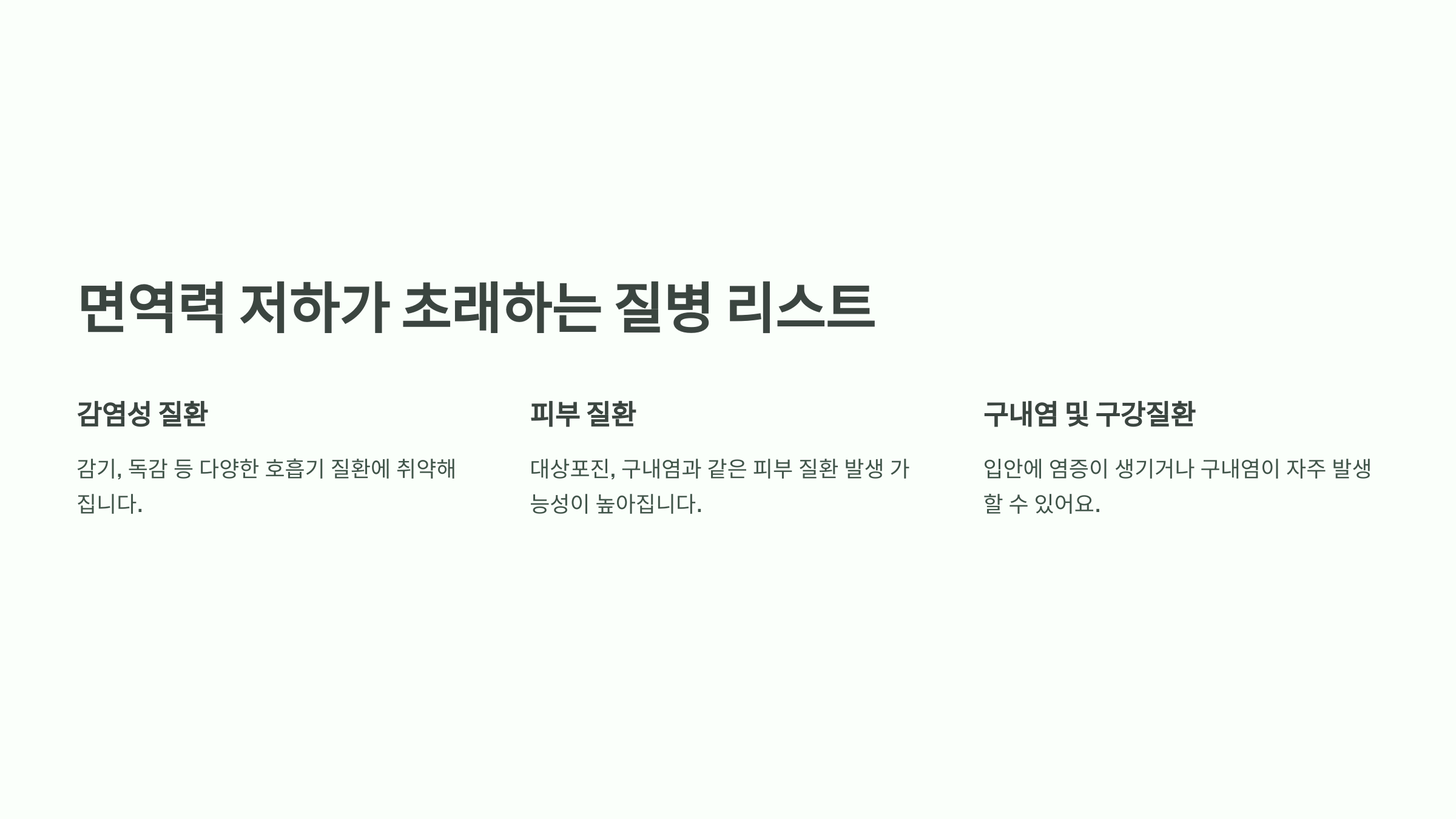 A3. 감기, 독감, 폐렴, 대상포진이 대표적이에요. 또한 면역력이 약해지면 구내염, 장염, 피부질환도 쉽게 생길 수 있어요.