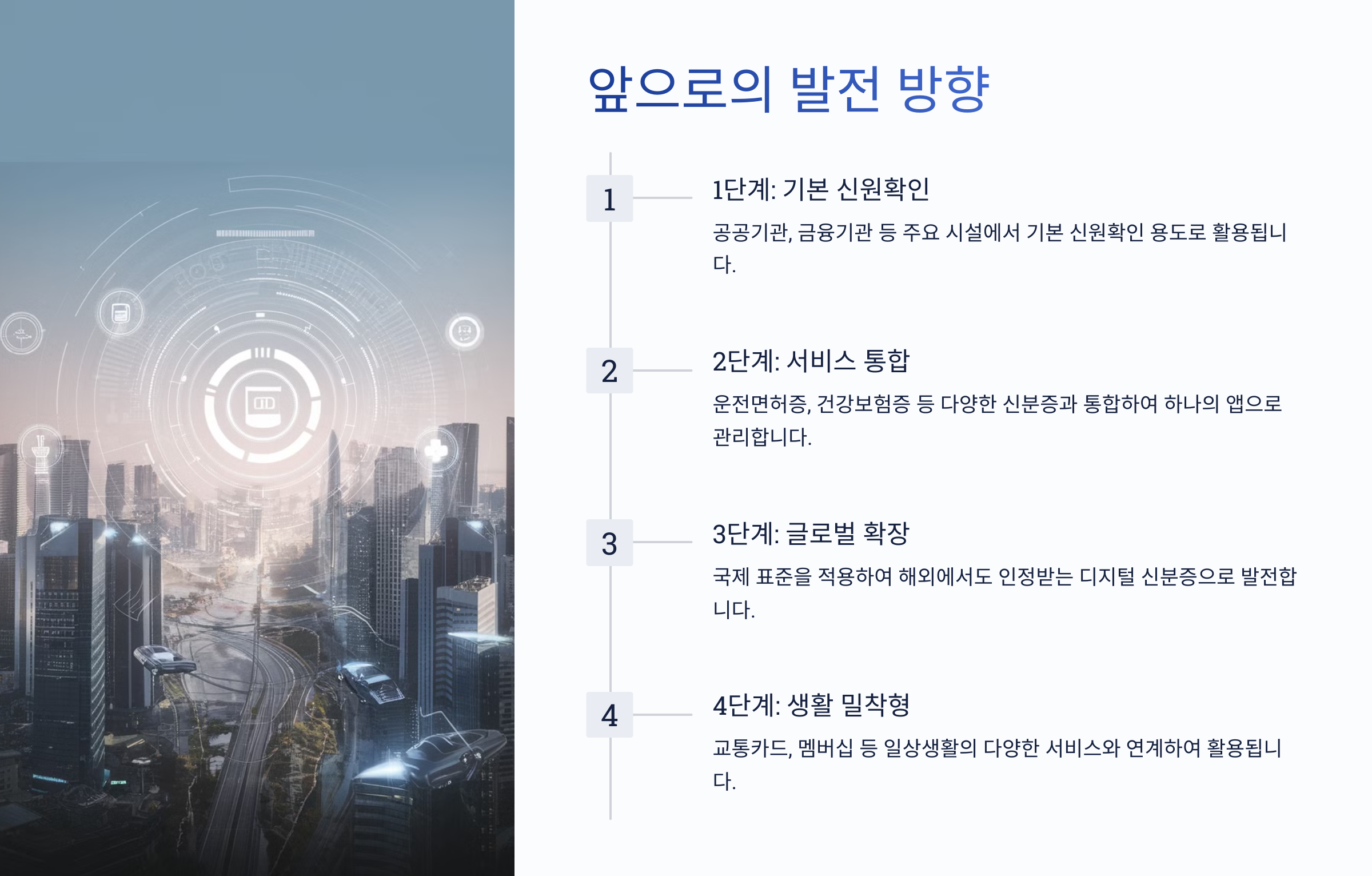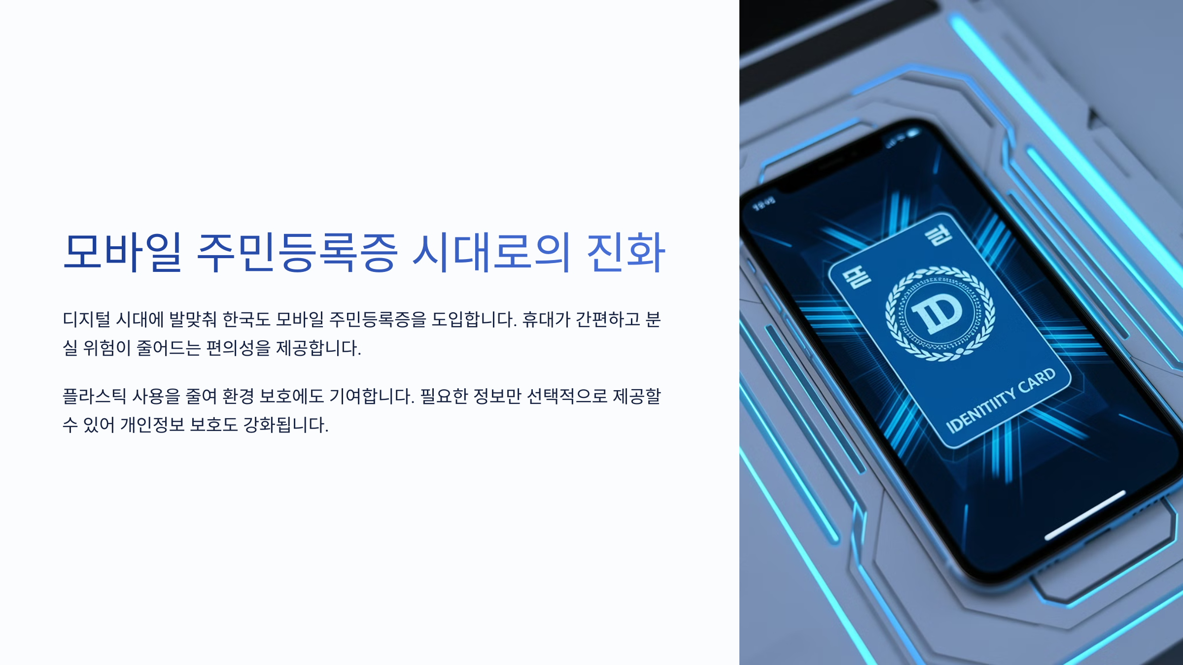 이런 문제를 해결하기 위해 정부는 디지털 신원증명 시스템을 도입하기로 했어요. 스마트폰이 보편화되면서 모바일 기반의 신분증이 기존의 실물 신분증과 함께 활용될 수 있도록 한 것이죠.