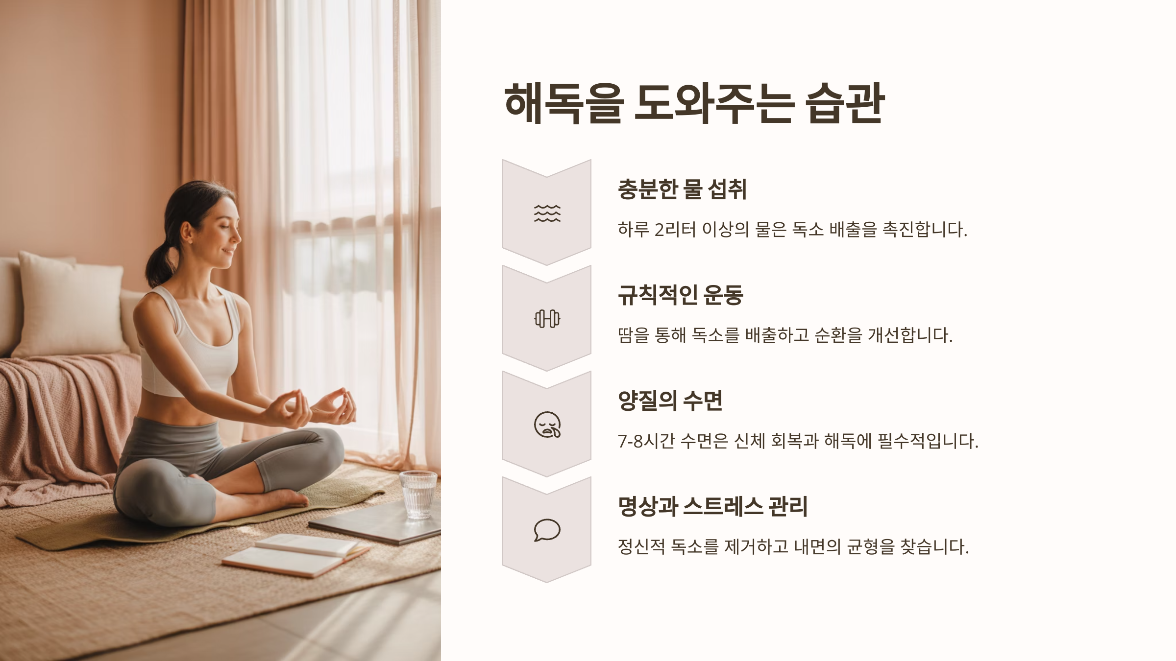 해독은 하루아침에 이루어지지 않아요. 하지만 좋은 습관을 조금씩 쌓아가면, 몸이 스스로 정화할 수 있는 환경이 만들어져요. 아래 6가지를 매일 실천해보세요!
