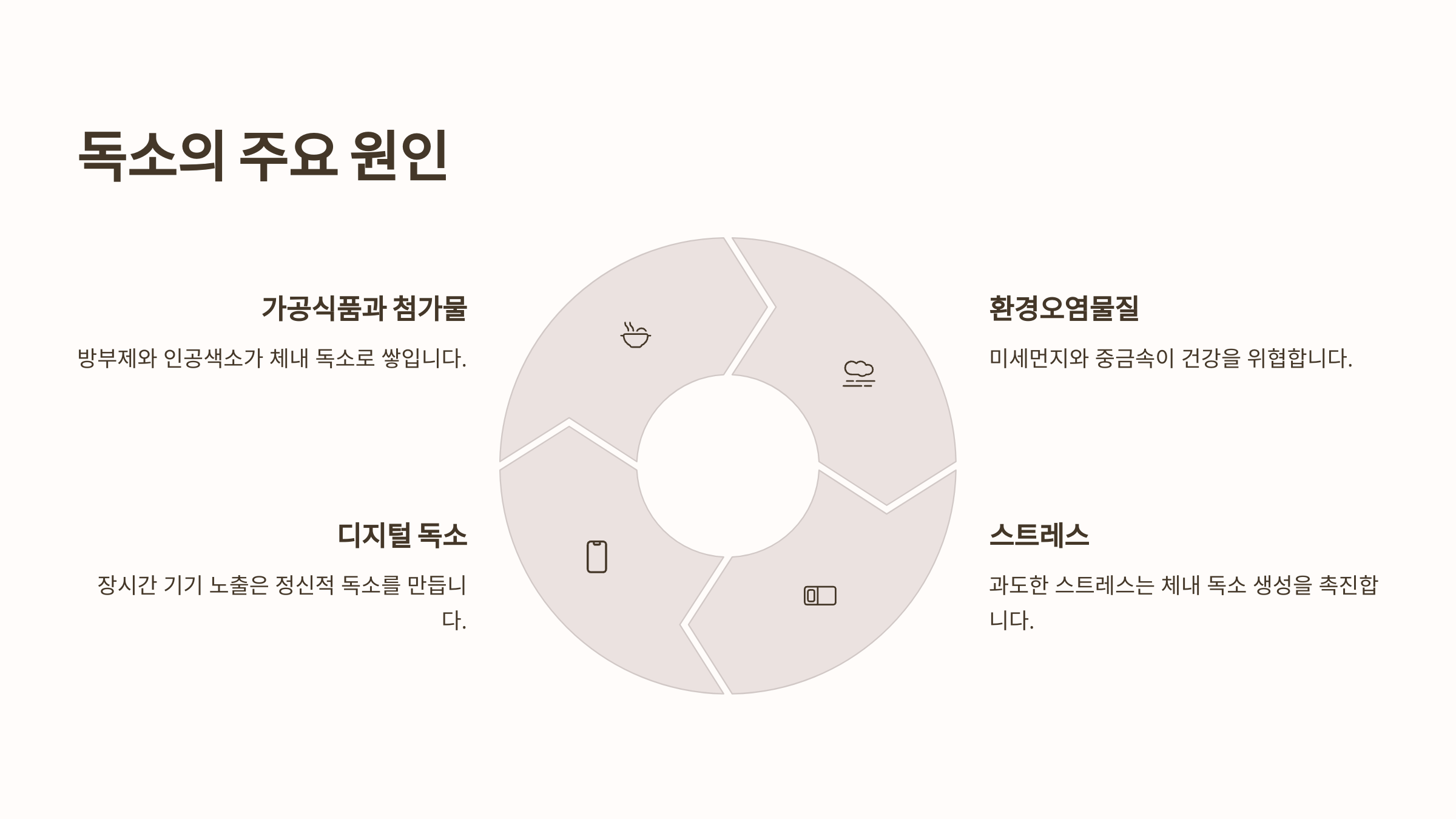 현대인이 접하는 독소는 생각보다 훨씬 많고 다양해요. 아래는 대표적인 독소 유입 경로예요: