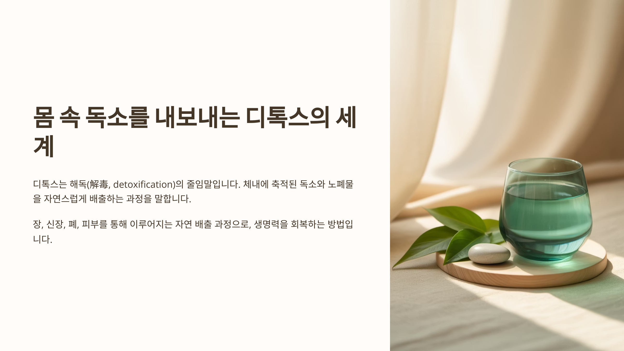 디톡스(Detox)는 몸에 쌓인 유해물질, 노폐물, 중금속, 환경호르몬 등을 체외로 배출시키는 과정을 말해요. 단순히 '굶는 단식'이 아니라, 내 몸의 자연 해독 시스템을 활성화시켜주는 건강한 습관이에요.