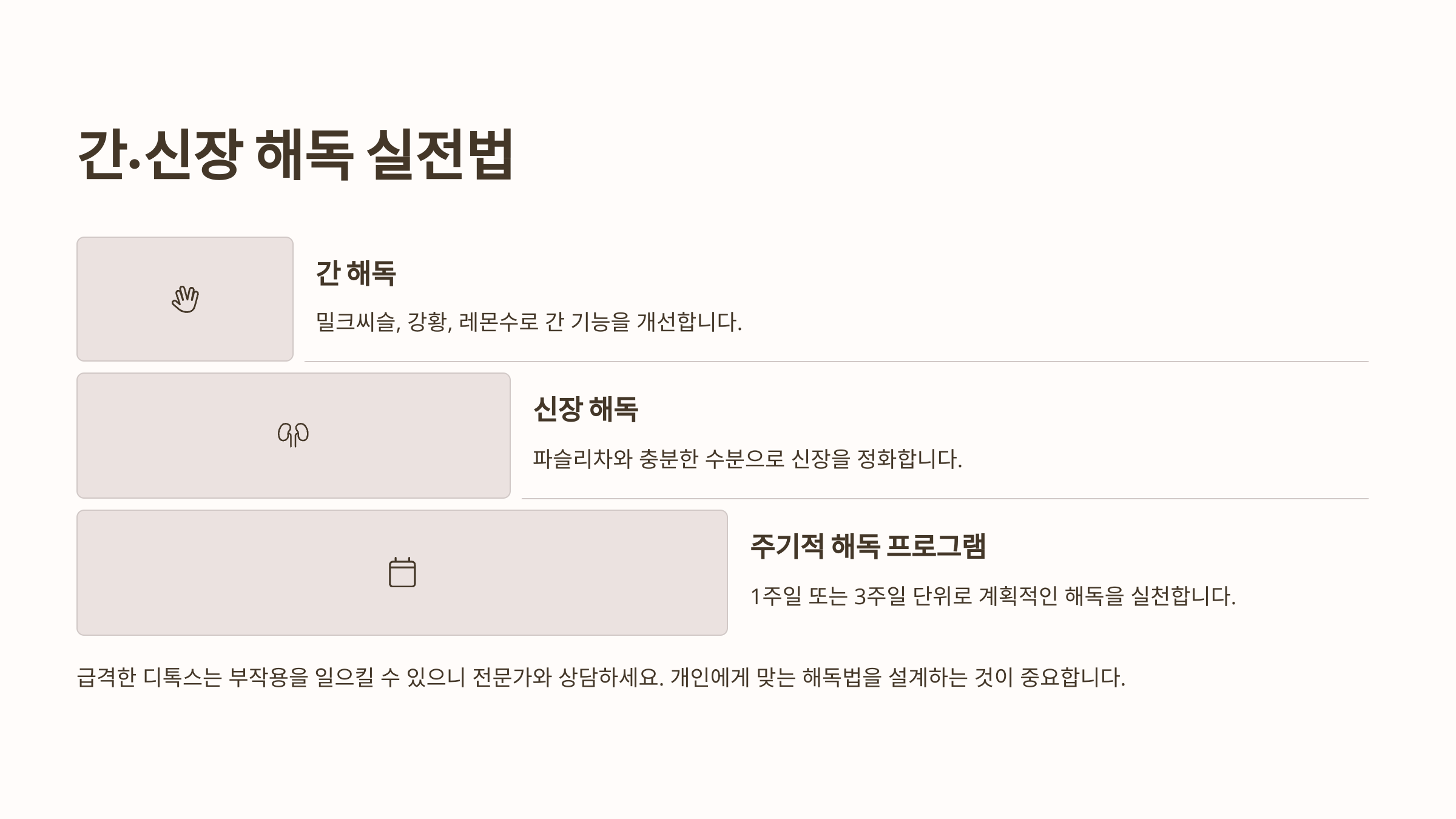 해독기관은 간, 신장, 림프계로 나뉘어요. 각 기관별로 도와줄 수 있는 방법을 아래에 정리했어요: