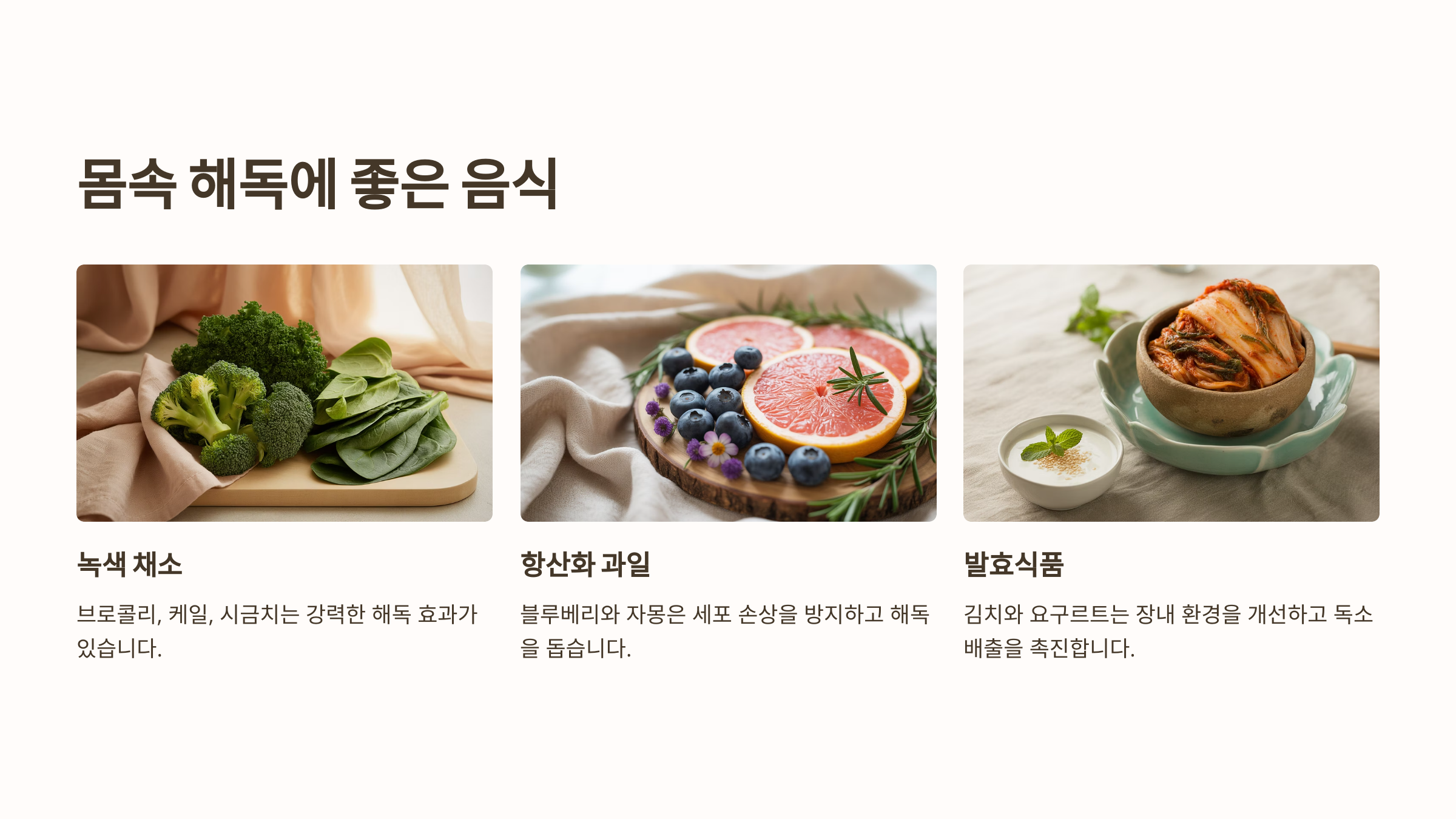 자연이 주는 해독 음식은 많아요. 이 중 일부만 매일 식단에 포함시켜도 해독 효율은 눈에 띄게 올라가요.