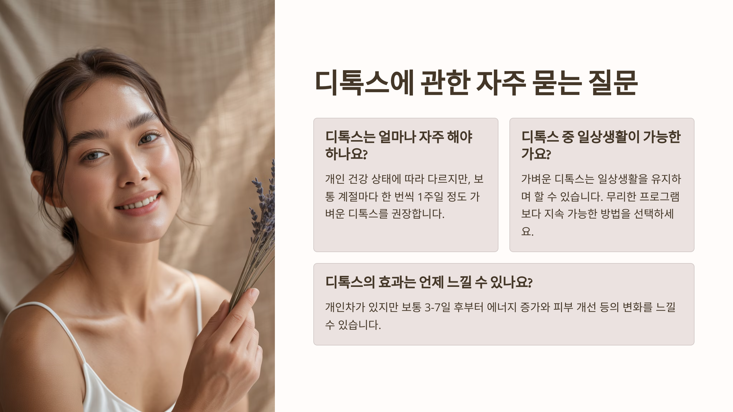 디톡스는 음식, 수면, 운동, 마음 관리까지 전반적인 생활 패턴을 정비하는 걸 포함해요. 단순한 단식보다는 ‘건강한 배출’이 핵심이에요.