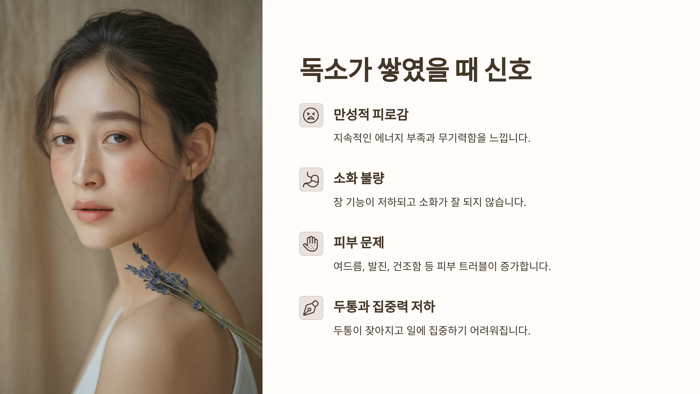 몸에 독소가 쌓이면 다양한 형태로 몸이 SOS 신호를 보내요. 그냥 피곤하거나 컨디션 난조라 생각할 수 있지만, 아래 증상들이 반복된다면 해독이 필요하다는 뜻일 수 있어요.
