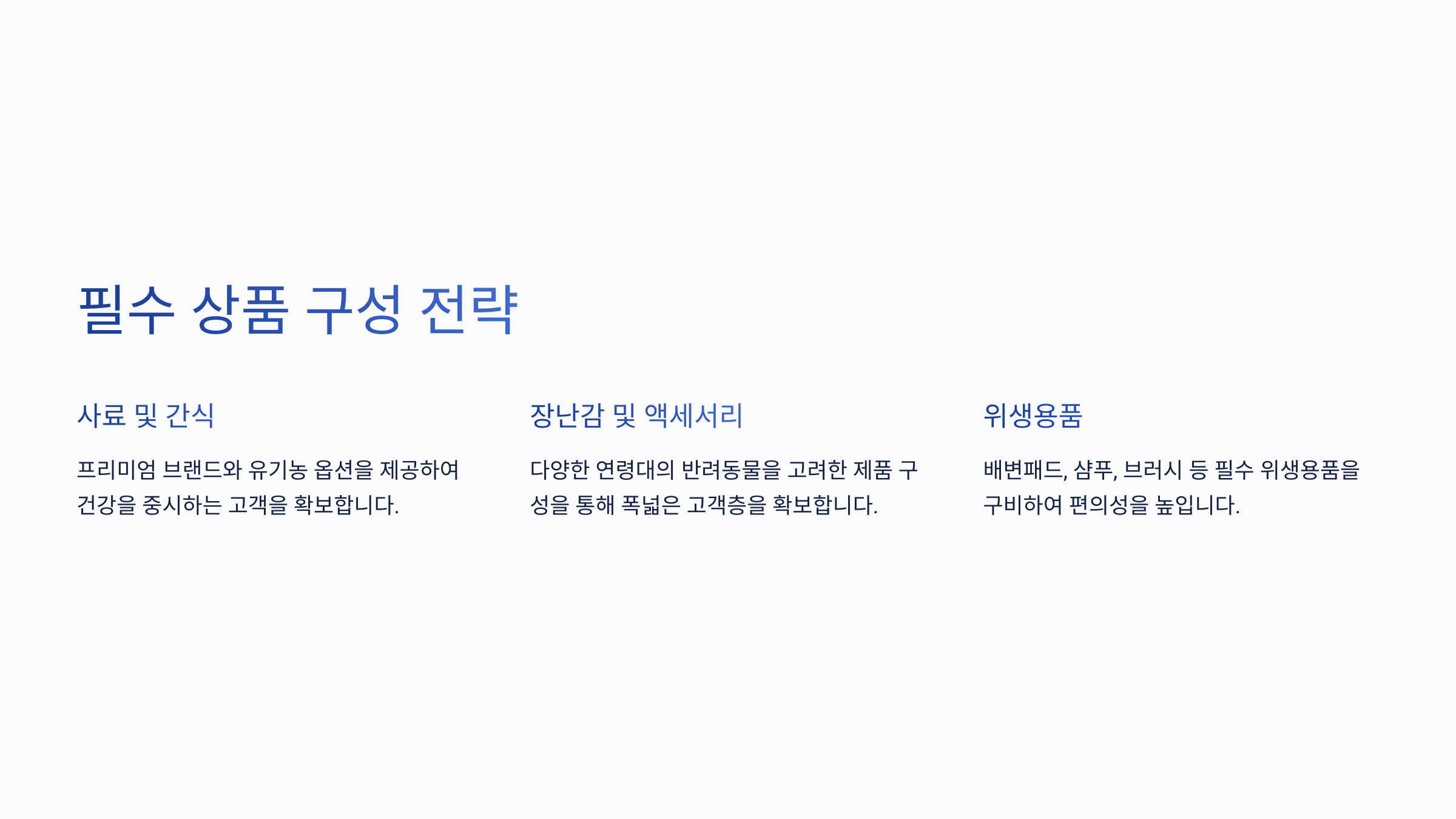 그래서 반려동물 용품점을 준비할 때는 시장 트렌드를 반영한 제품 구성이 정말 중요해요. 요즘은 저렴한 제품보다 안전하고 고급스러운 제품을 선호하는 분위기라서, 상품을 고를 때부터 신중해야 해요.