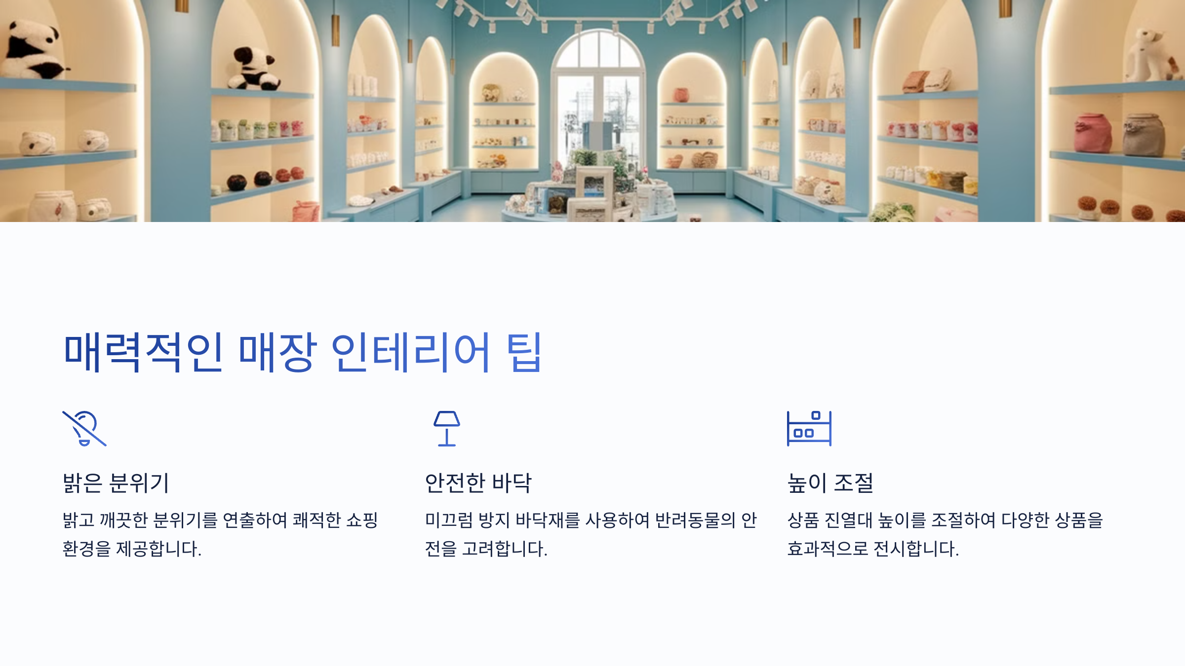 반려동물 용품점의 인테리어는 깔끔하고 따뜻한 분위기를 주는 게 좋아요. 사람뿐 아니라 반려동물도 함께 방문하는 곳이기 때문에 미끄럼 방지 바닥재, 턱 없는 출입구, 넓은 동선 등을 고려해야 해요. 이렇게 동물 친화적인 디자인이 고객 만족도를 높여줘요.