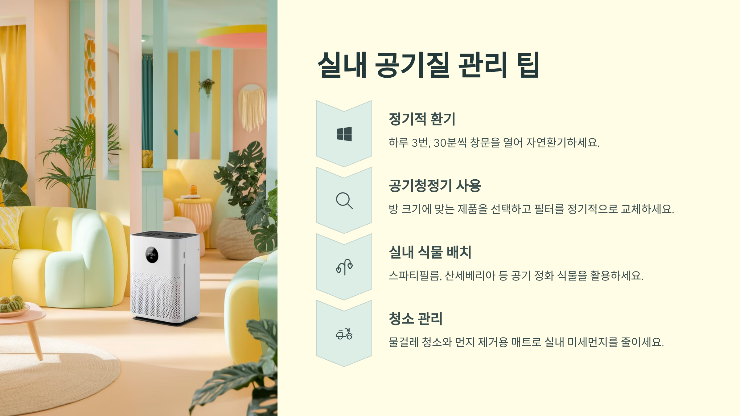 공기청정기는 반드시 HEPA 필터가 있는 제품으로 사용하고, 필터는 2~3개월에 한 번씩 꼭 교체해줘야 해요. 먼지 많은 날에는 청정기를 하루 종일 켜두는 것도 방법이에요.