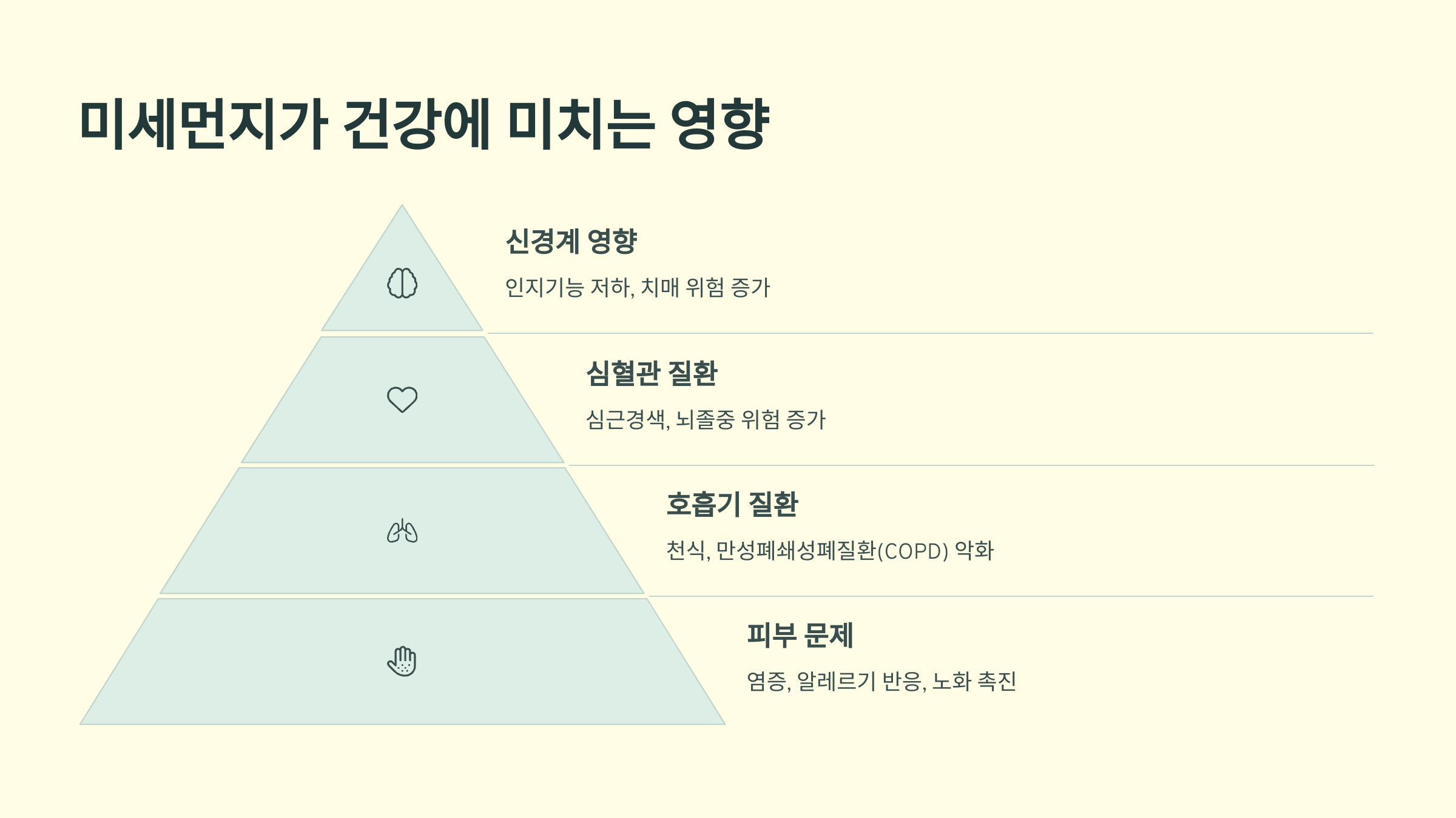 미세먼지는 단순히 공기를 더럽히는 것 이상으로, 우리 몸 곳곳에 영향을 줘요. 특히 호흡기, 심혈관계, 피부 건강까지 방해받게 되고, 면역력이 약해진 사람에게는 감기나 비염 같은 질환으로 이어지기도 해요.