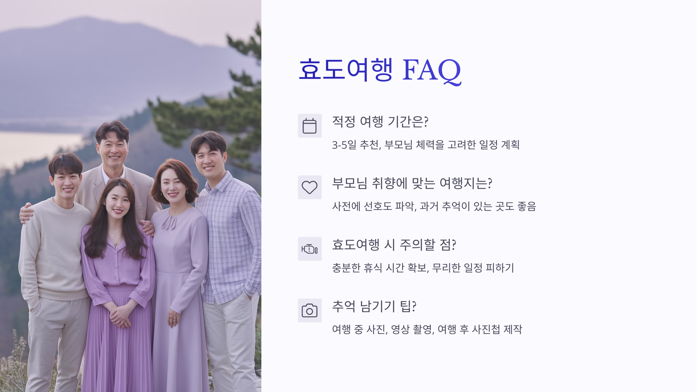 효도여행은 부모님의 나이와 건강 상태에 맞게 여행지를 선택하는 것이 중요해요. 무리 없는 일정, 편안한 동선, 그리고 쉼이 있는 여행이 핵심이에요.
