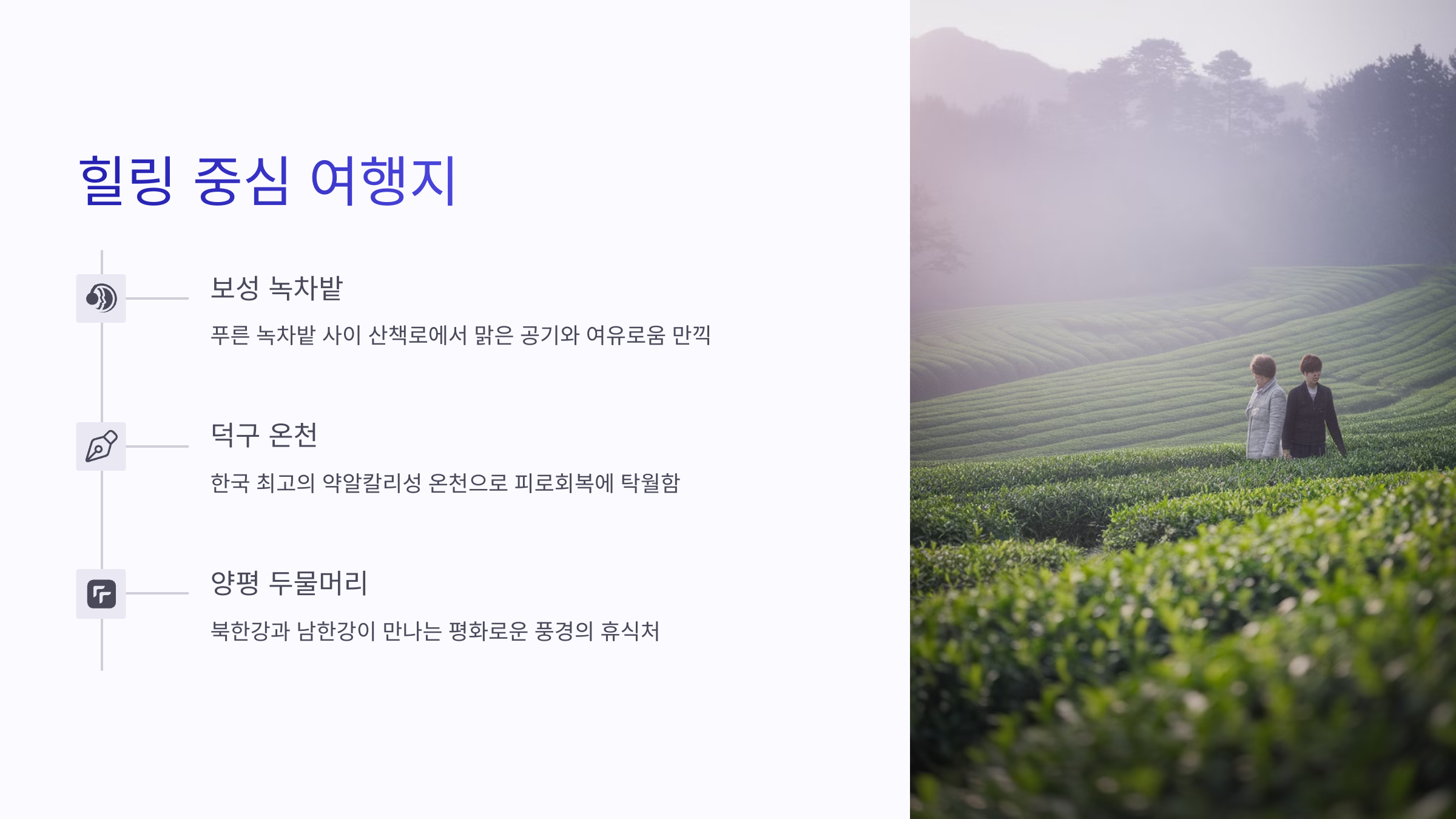 | 70대 | 보성, 강화도 | 산책 + 온천 | 조용하고 무리 없는 코스 |