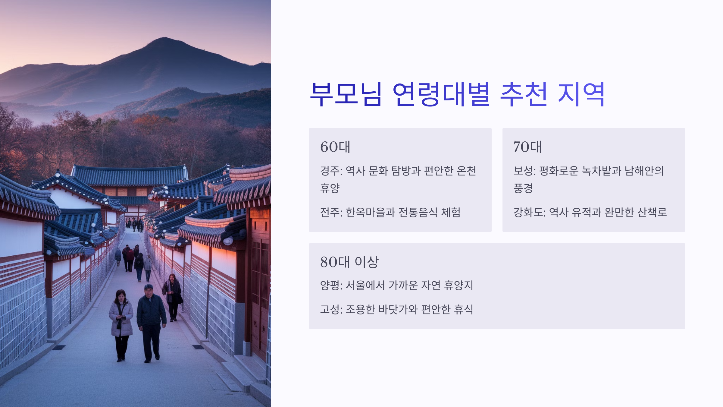 연령대별로 다르게 설계하면 부모님도 훨씬 편하게 여행하실 수 있어요. 다음은 힐링 가득한 여행지들로 안내할게요~ 🌿