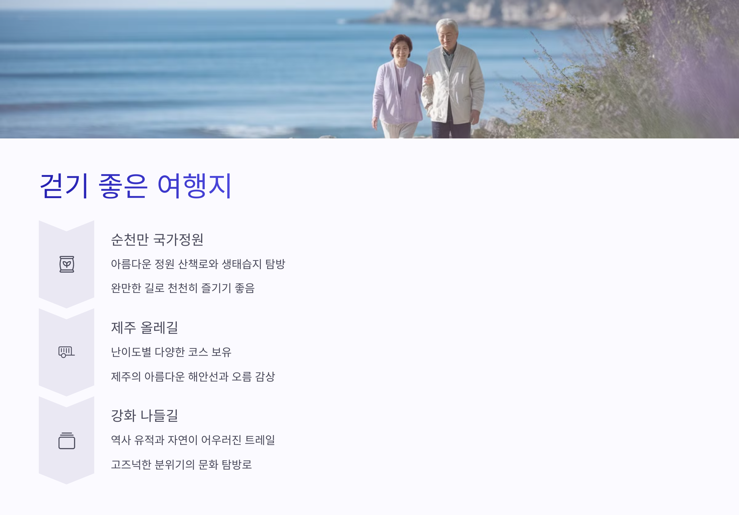 ✔ 70대 이상: 단체보다는 소규모, 걸음이 편한 산책형 여행이 적합해요. 온천, 한옥마을, 바닷가 산책 등이 좋아요.