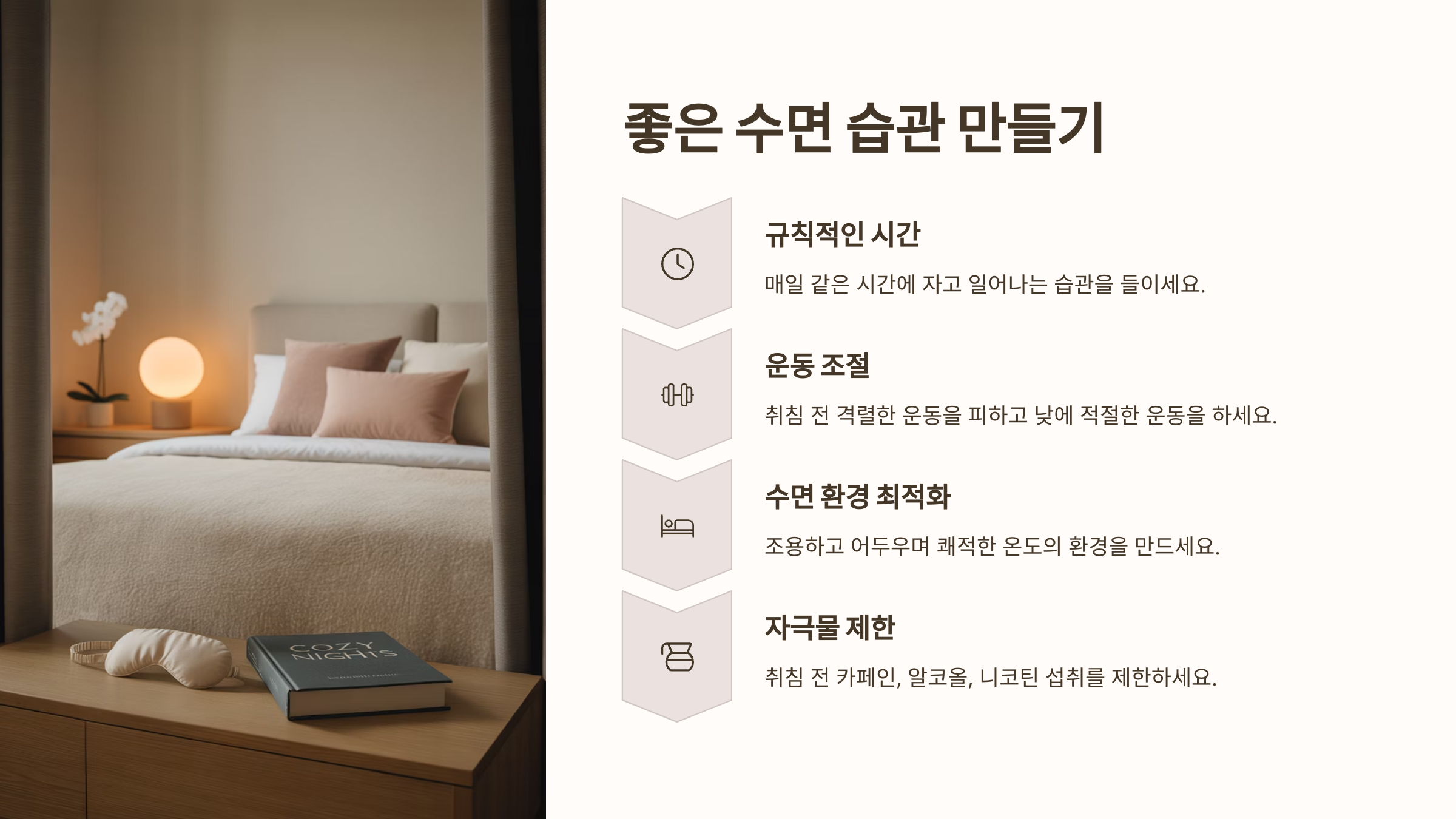 - 📴 **자기 전 전자기기 끄기** – 블루라이트가 멜라토닌을 억제해요.