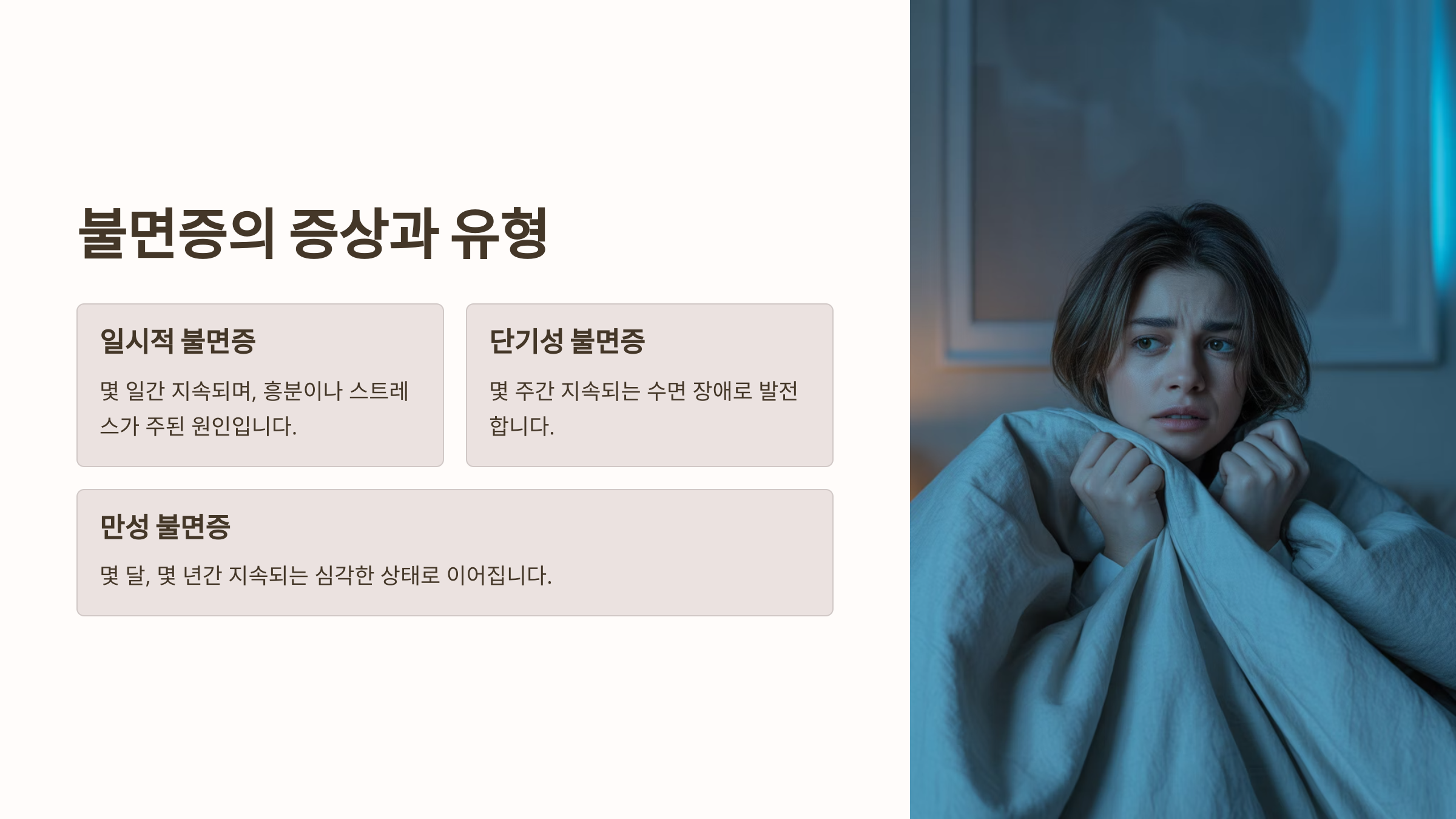 각 증상은 단독으로 나타나기도 하지만, 복합적으로 겹치기도 해요. 특히 입면장애와 중간각성이 동시에 오는 경우가 많아요. 나의 유형을 명확히 아는 것이 해결의 첫걸음이에요!