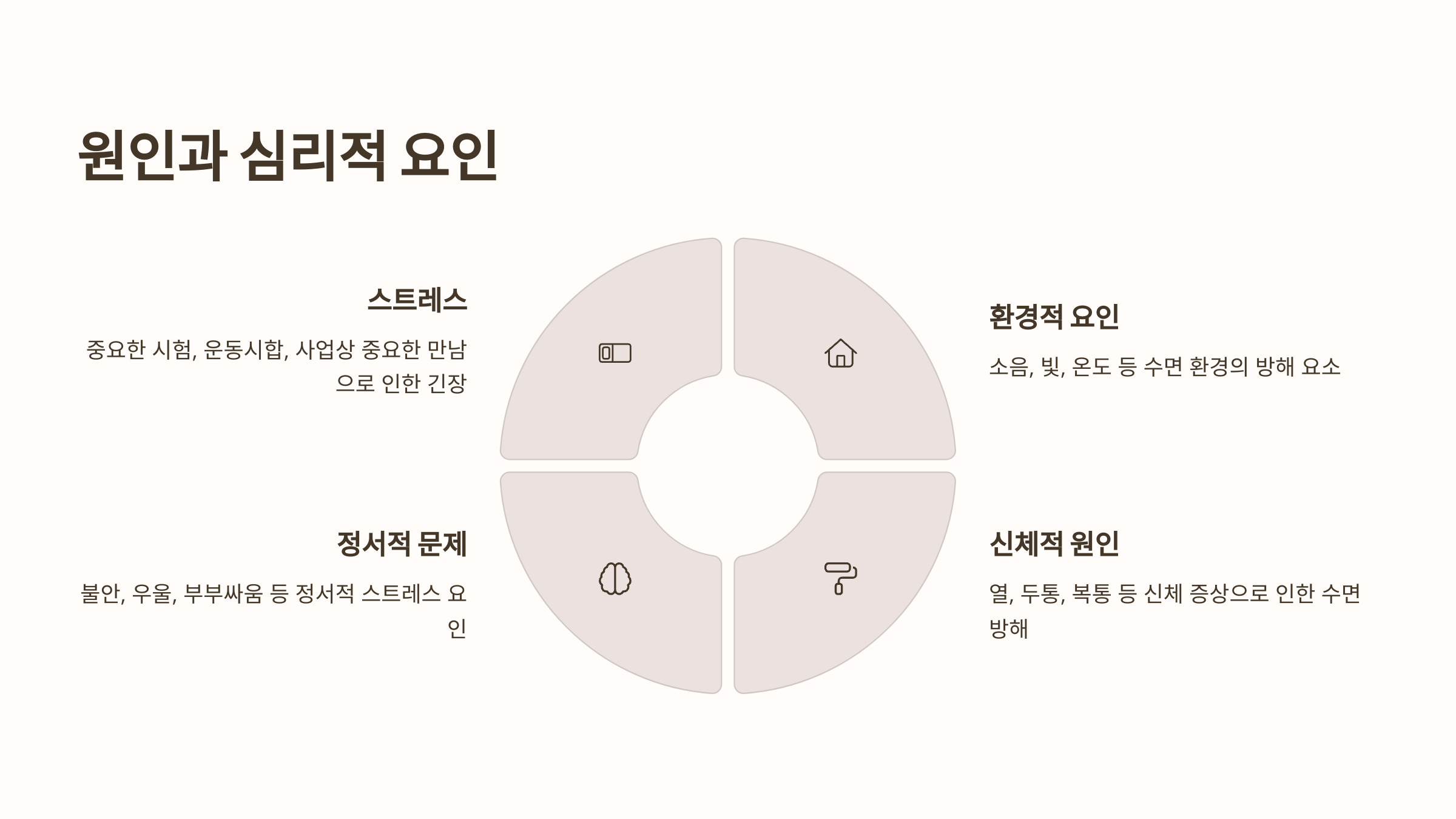 또한 불규칙한 수면 시간, 낮잠 습관, 스마트폰 사용 같은 환경적 요인도 원인이에요. 커피나 에너지 음료, 늦은 저녁 식사도 잠을 방해하는 대표 주자들이죠.