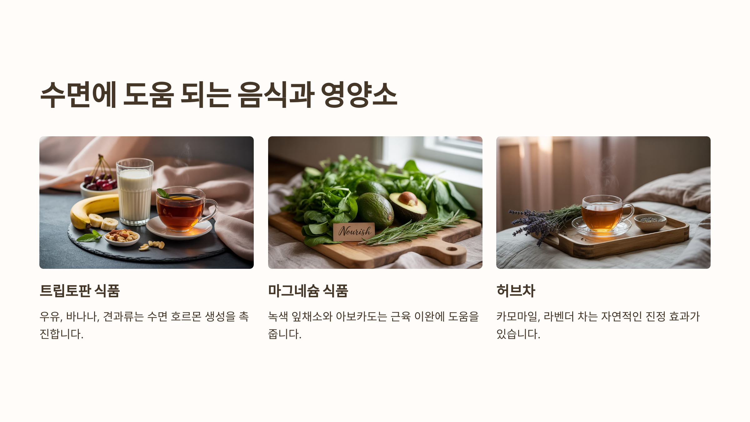 이 영양소들은 수면을 유도하는 신경전달물질을 만들어주는 재료예요. 식사나 보충제로 꾸준히 섭취하면 수면의 질에 큰 도움을 줄 수 있어요.