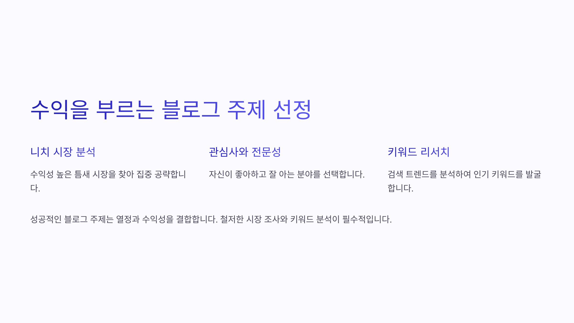블로그로 수익을 내기 위해 가장 중요한 건 바로 '주제'예요. 아무리 글을 많이 써도 사람들이 관심 없는 주제라면 방문자가 없고, 결국 수익도 없겠죠? 그래서 2025년에 돈이 되는 인기 주제를 골라야 해요.