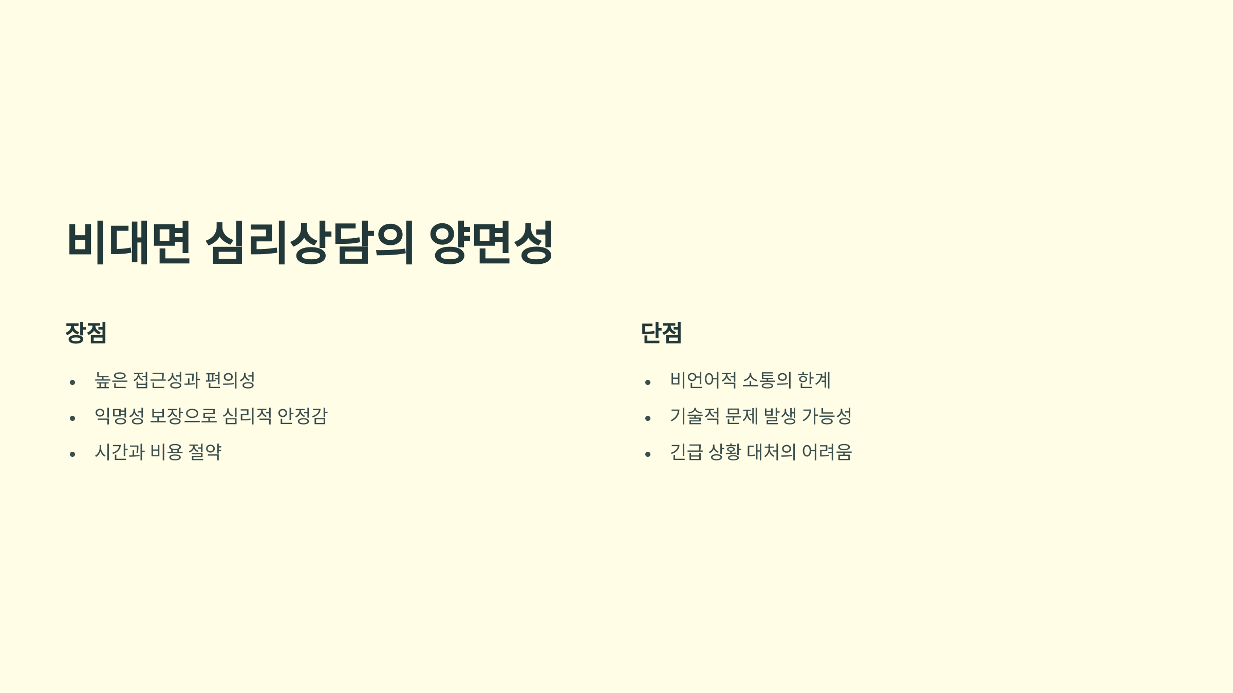 | 익명성 | 마음 편하게 말할 수 있음 | 상담사와의 유대감 부족 |