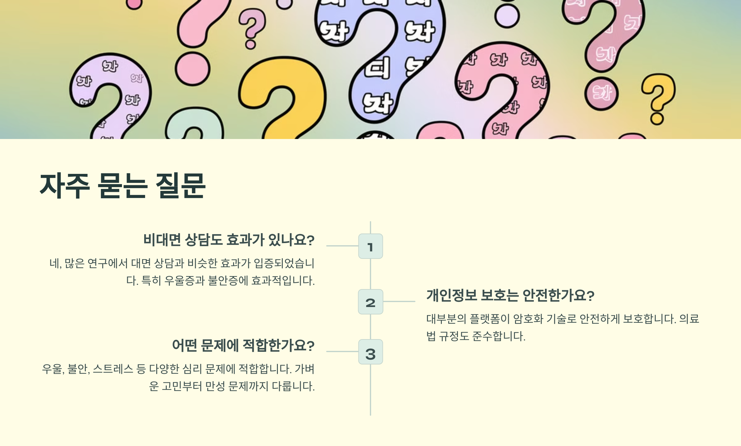 많은 사람들이 "말하기 시작하니까 마음이 훨씬 가벼워졌어요"라는 후기를 남겨요. 비대면 상담은 익명성도 보장돼서 민감한 이야기나 감정을 털어놓기 더 쉬운 경우도 많아요.