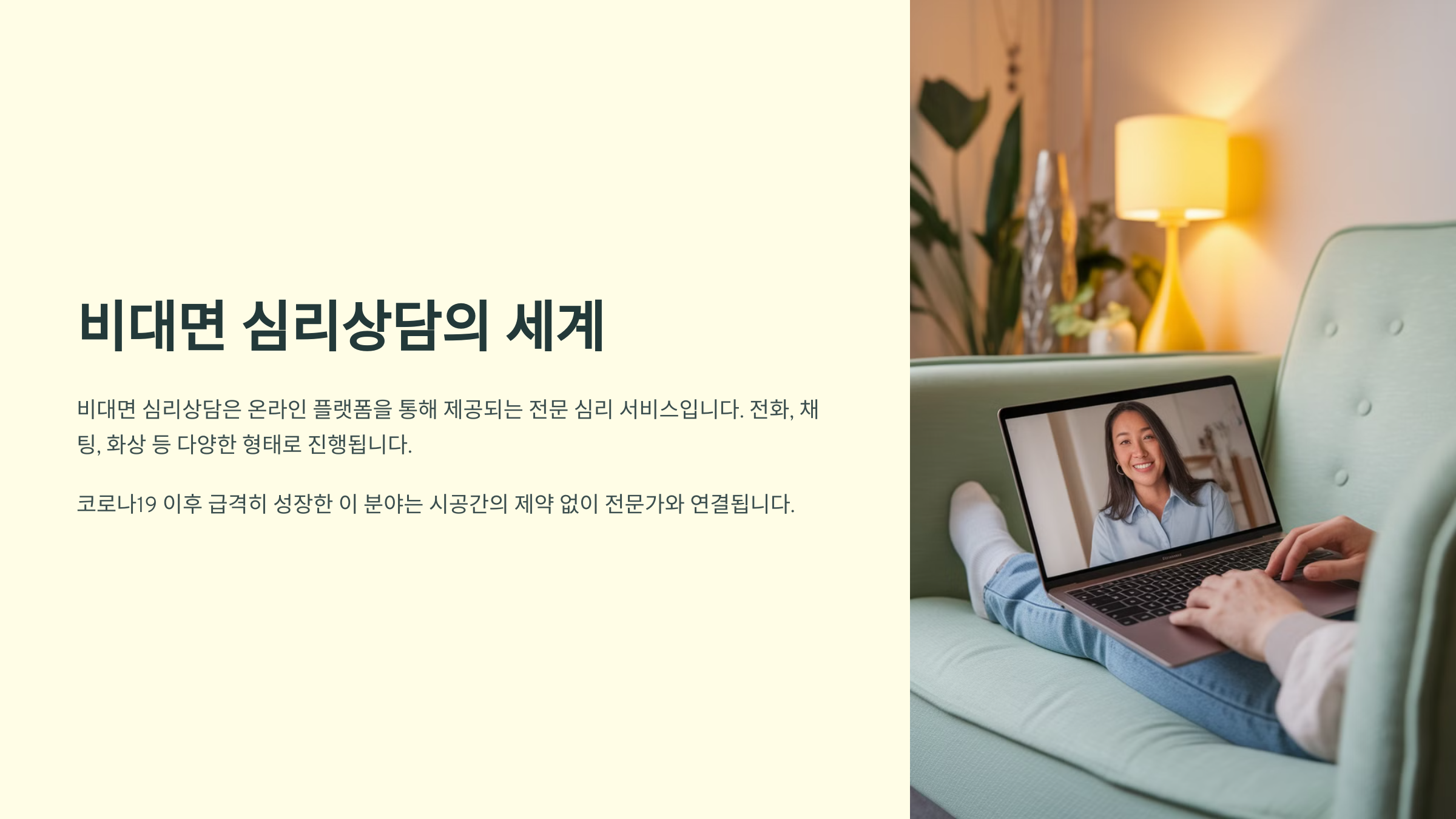 비대면 상담은 화상통화나 채팅, 전화 등으로 진행하는 정신건강 상담이에요. 코로나19 이후로 수요가 급증했고, 지금은 하나의 표준 상담 형태로 자리 잡았어요.