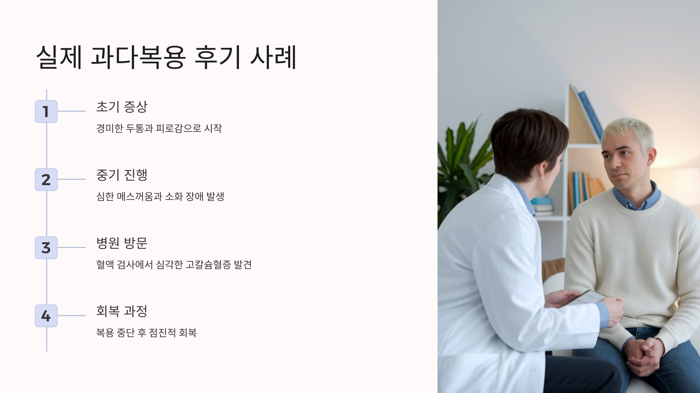 특히 자가진단 없이 영양제를 무턱대고 복용하다가 심각한 신장 기능 저하나 고칼슘혈증을 겪는 사례도 속출하고 있어요. 실제 후기들을 통해 이 문제의 심각성을 한번 제대로 살펴볼게요.