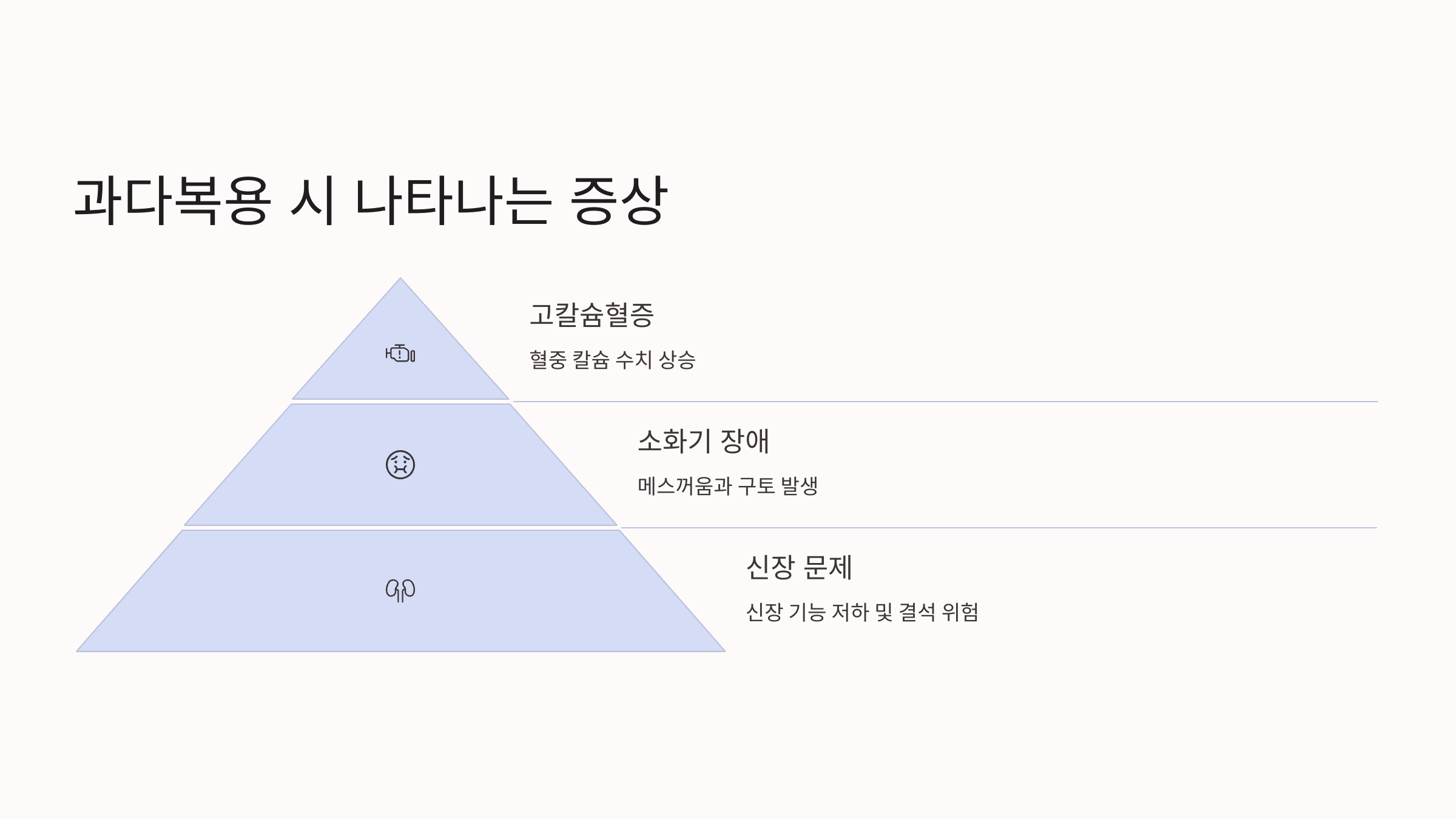 2. 장기 복용 시엔 반드시 마그네슘과 함께 복용하세요. 단독 복용은 부작용 위험을 높일 수 있어요.