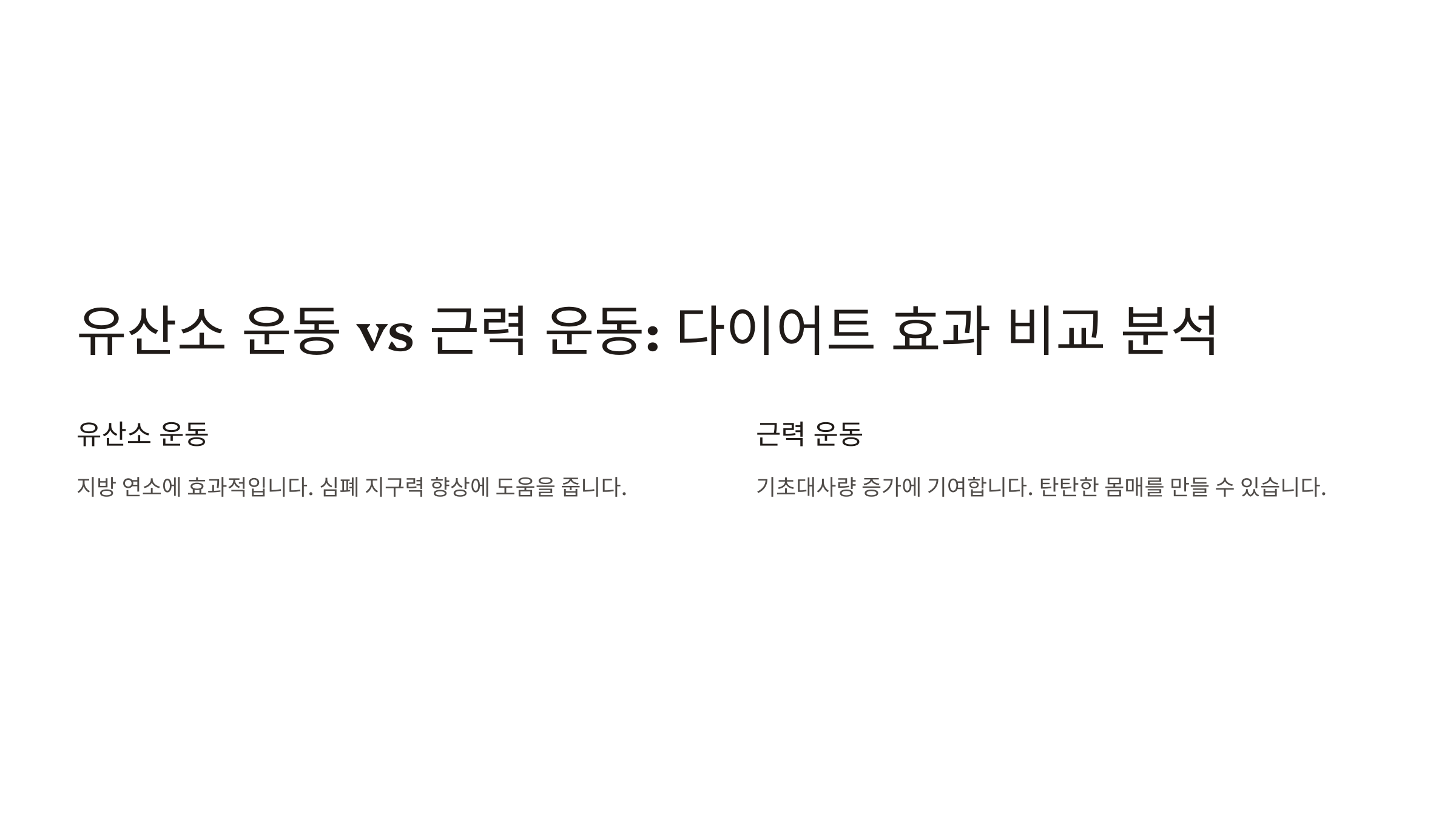| 유산소운동 | 체지방 연소, 심폐 건강 향상 | 근육 손실 가능성 |