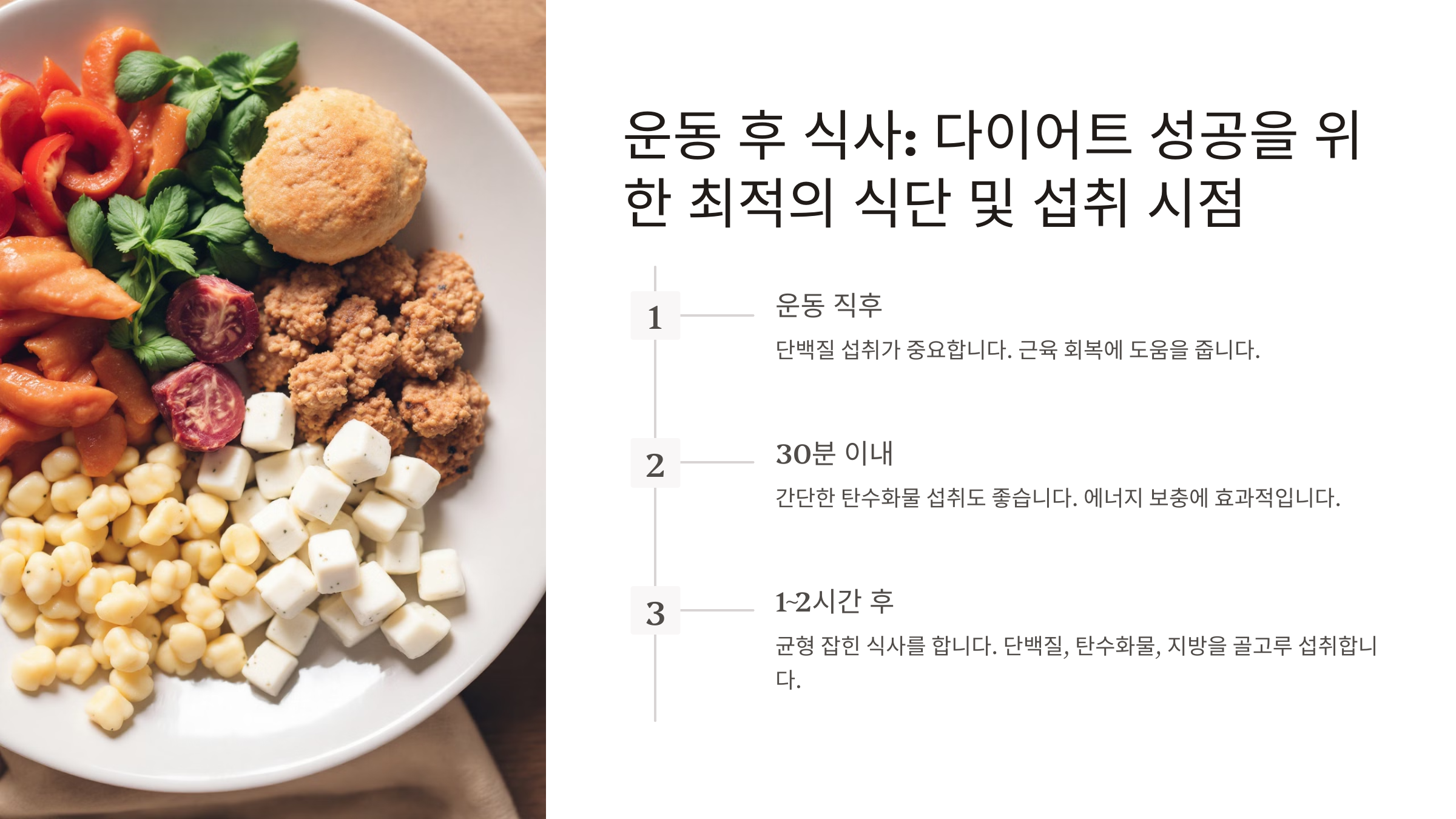 운동 후에는 단백질과 탄수화물을 균형 있게 섭취하는 것이 중요해요. 이렇게 하면 근육량 유지와 체지방 감소에 도움이 될 수 있답니다! 💪🍽️