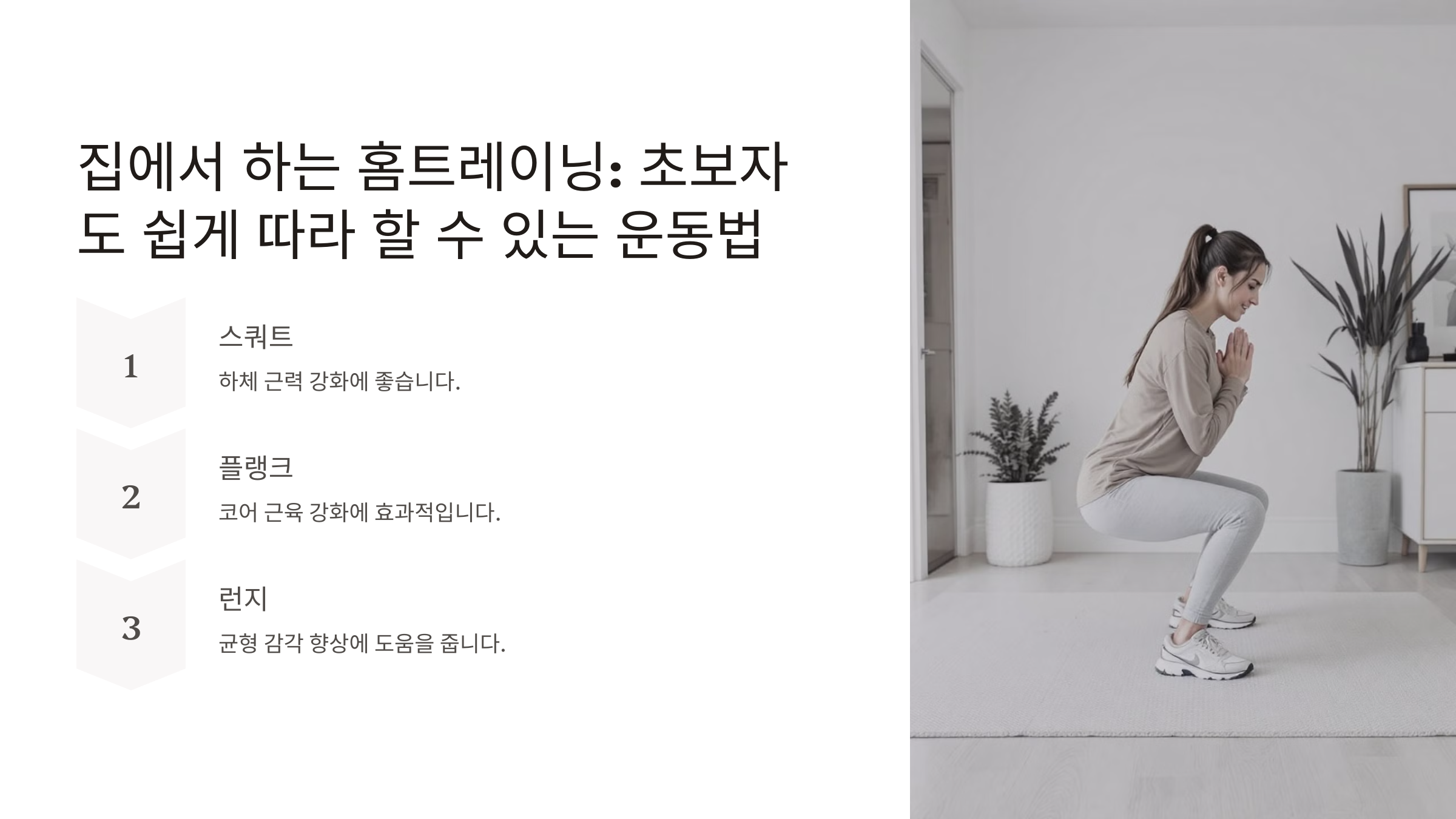 홈트레이닝의 장점은 언제든지 할 수 있고, 공간이 좁아도 가능하다는 점이에요. 또한, 자신의 체중을 이용한 운동이 많아 부상의 위험도 낮아요.