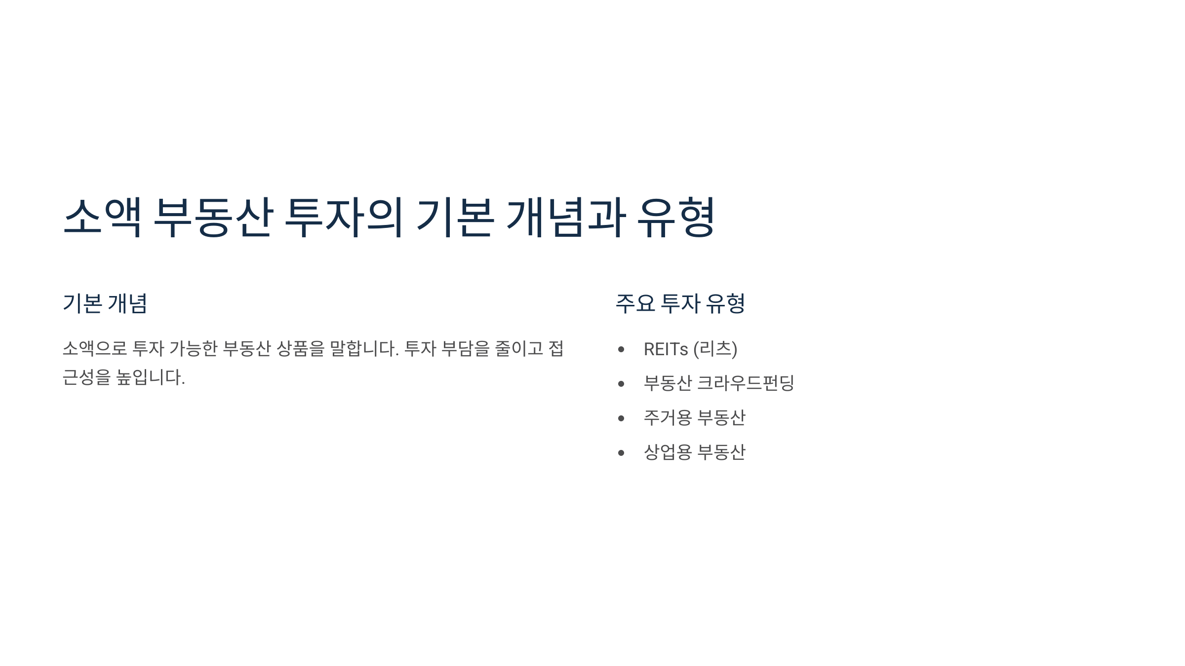 🏢 부동산 투자는 꼭 건물을 사야 하는 것이 아니에요. 적은 금액으로도 투자할 수 있는 다양한 방법이 있어요. 여기서는 대표적인 소액 부동산 투자 유형을 소개할게요.
