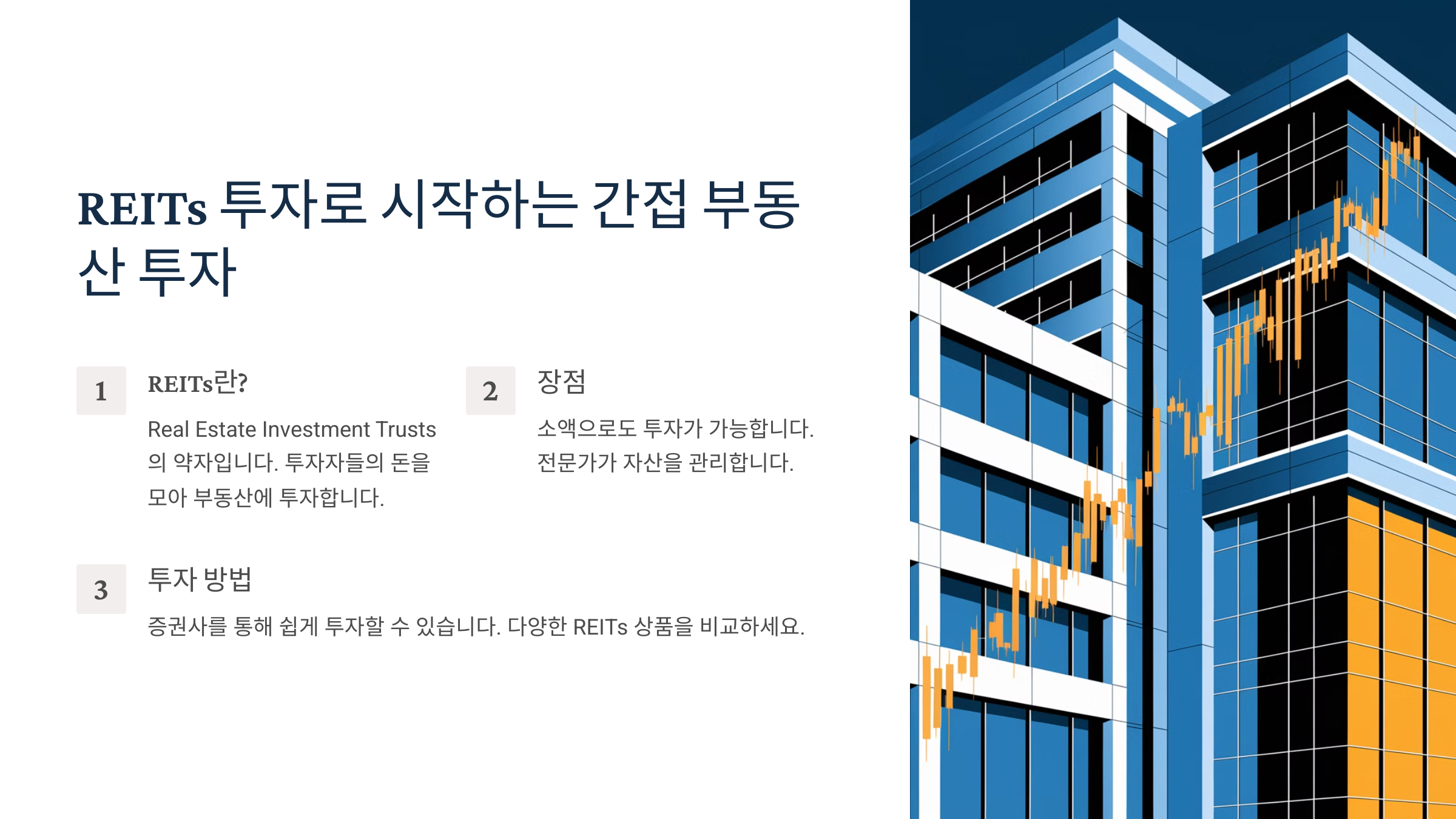 | 리츠(REITs) | 10만 원~ | 배당 수익 가능 | 주식시장 변동성 |