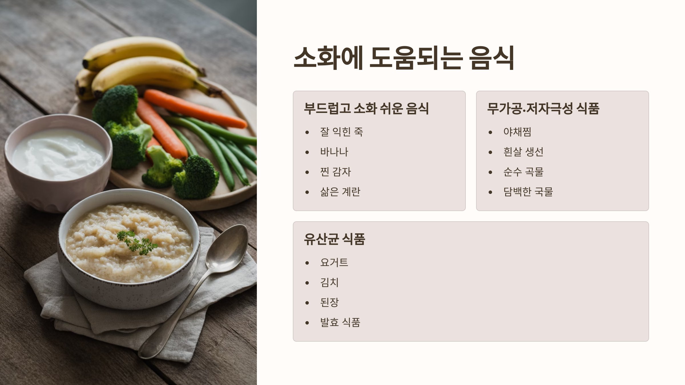 소화에 도움되는 음식은 위에 자극을 주지 않으면서 점막을 보호하고 위산을 조절하는 역할을 해요. 속이 더부룩할 땐 찬 음식보다 따뜻한 조리가 좋아요.