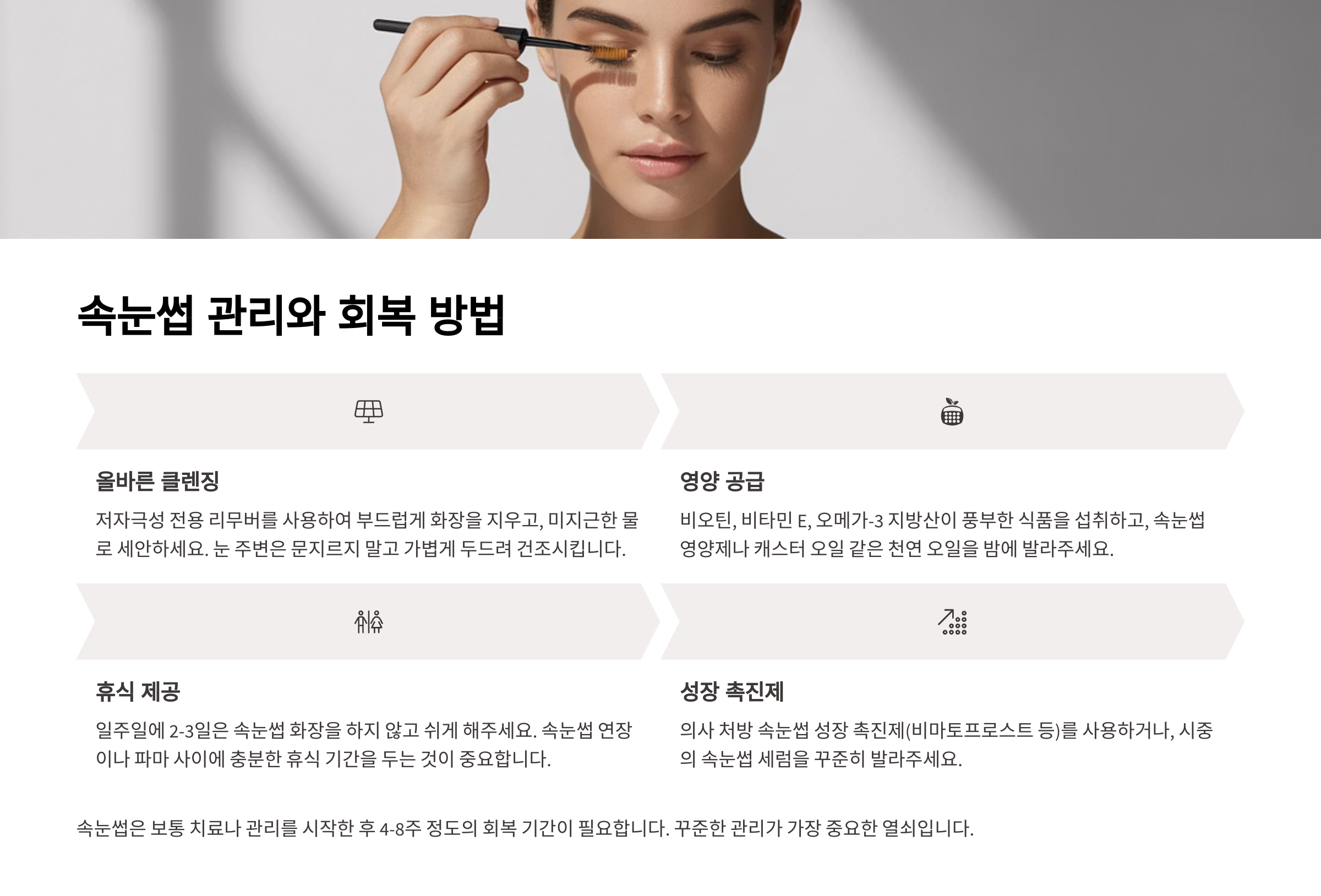 | 휴식기 마련 | 연장, 마스카라 최소 2주 휴식 | 회복 중엔 자극 피하기 |