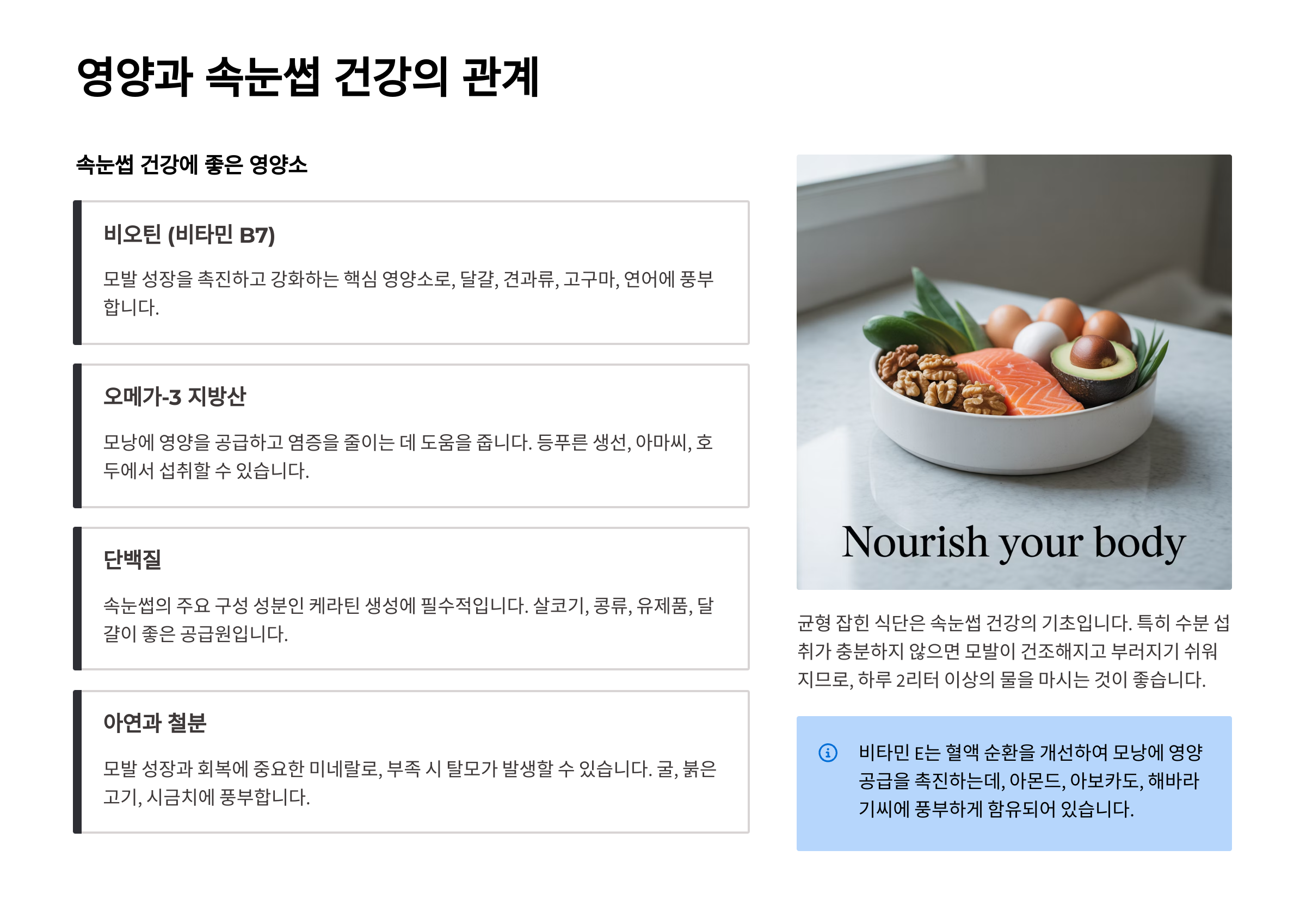 | 단백질 | 모발 구성, 모근 강화 | 달걀, 두부, 닭가슴살 |