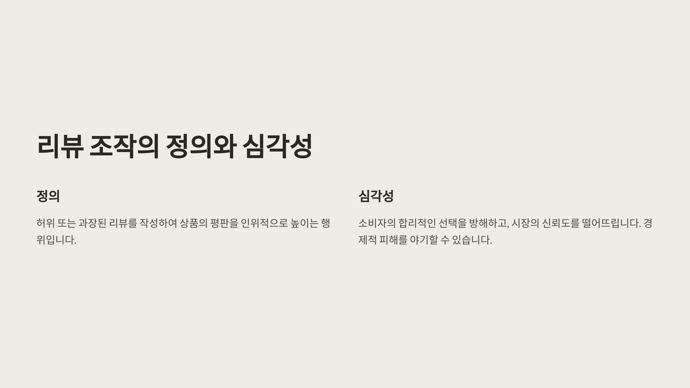 📢 리뷰 조작은 판매자가 의도적으로 허위 리뷰를 작성하거나, 조작된 리뷰를 구매하는 행위를 의미해요. 이는 소비자를 기만하는 불법 행위이며, 플랫폼의 신뢰도를 떨어뜨리는 주요 원인이에요.