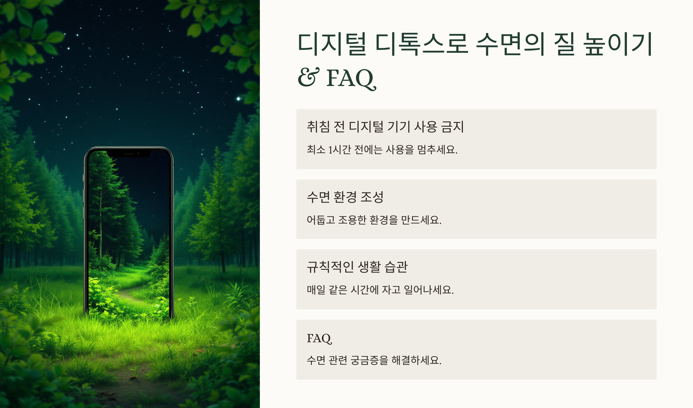 디지털 디톡스를 실천하면 수면의 질이 개선될 뿐만 아니라, 정신적인 안정감도 얻을 수 있어요. 오늘부터 조금씩 실천해보는 건 어떨까요? 😊🌿
