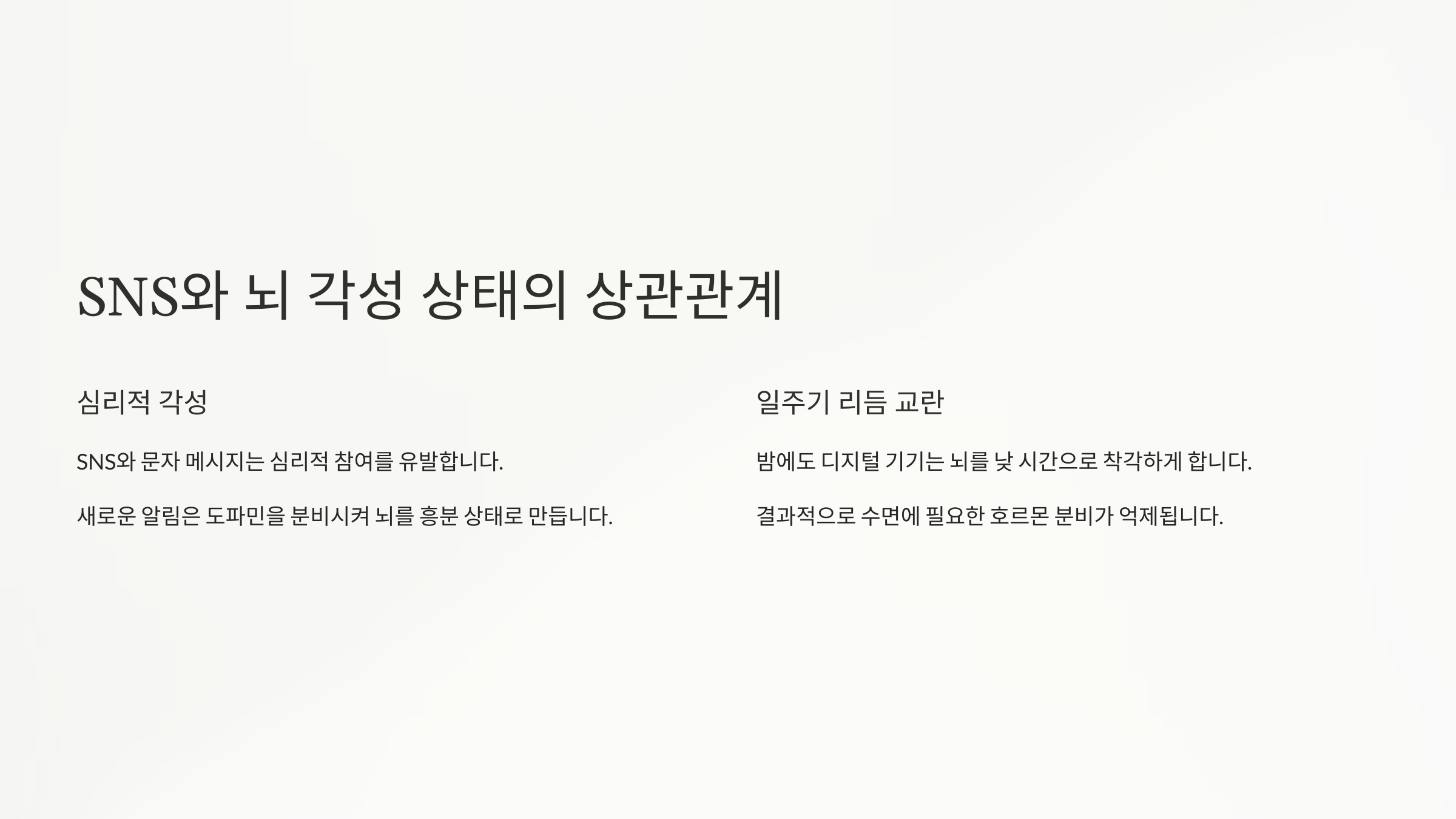 스마트폰 중에서도 특히 SNS는 뇌를 과도하게 자극해요. 누군가의 메시지, 사진, 좋아요, 댓글 반응은 즉각적인 피드백을 통해 도파민을 분비시키고, 뇌를 계속 깨어 있게 만들어요. 이런 자극은 ‘흥분 상태’를 유지하게 만들고, 긴장감을 완전히 풀지 못하게 해요.