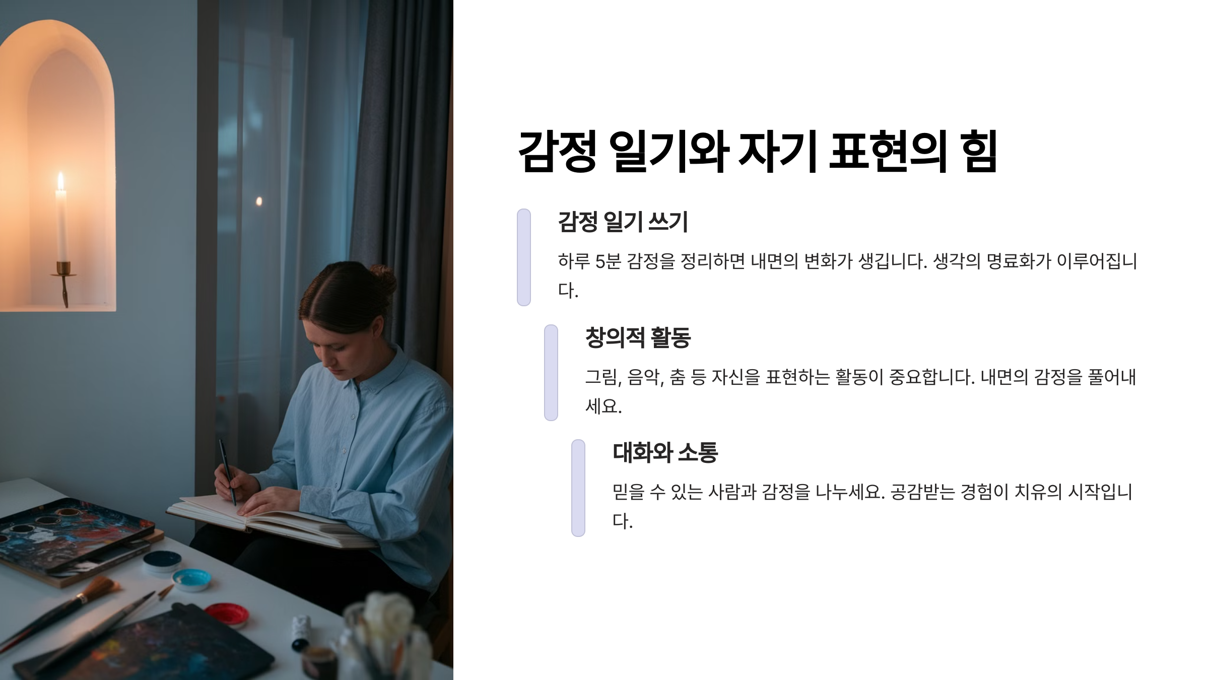 표현은 해소이고, 해소는 회복이에요. 마음을 쓰고, 말하고, 꺼내는 연습. 그것이 반복될수록 우리는 더 단단해져요 ✨