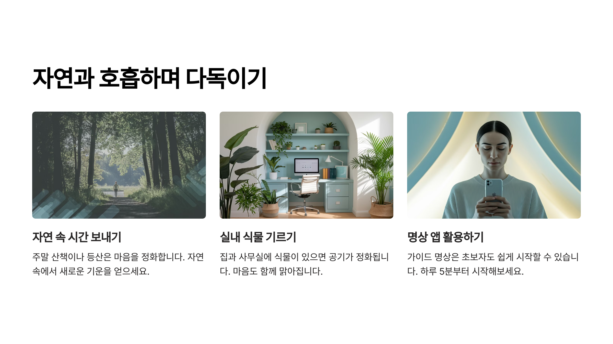 | 호흡 명상 | 5초 들숨, 5초 날숨 반복 | 아침 or 자기 전 |