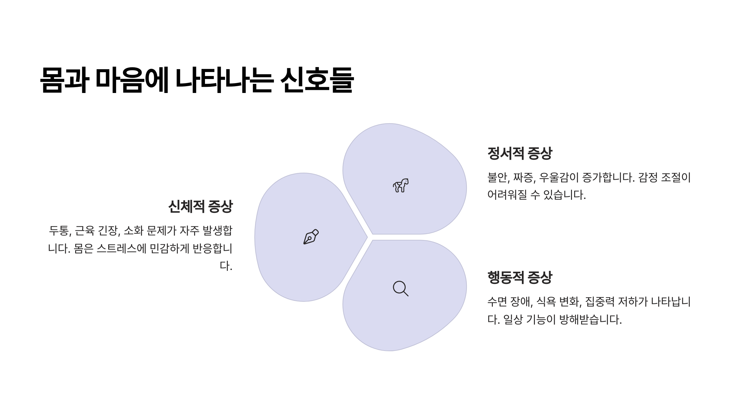 스트레스는 마음만의 문제가 아니에요. 호르몬, 신경계, 소화기관까지 전신에 영향을 주기 때문에 심리와 신체는 항상 함께 반응해요. 그래서 마음을 다스리는 것이 곧 몸을 회복시키는 일이기도 해요.