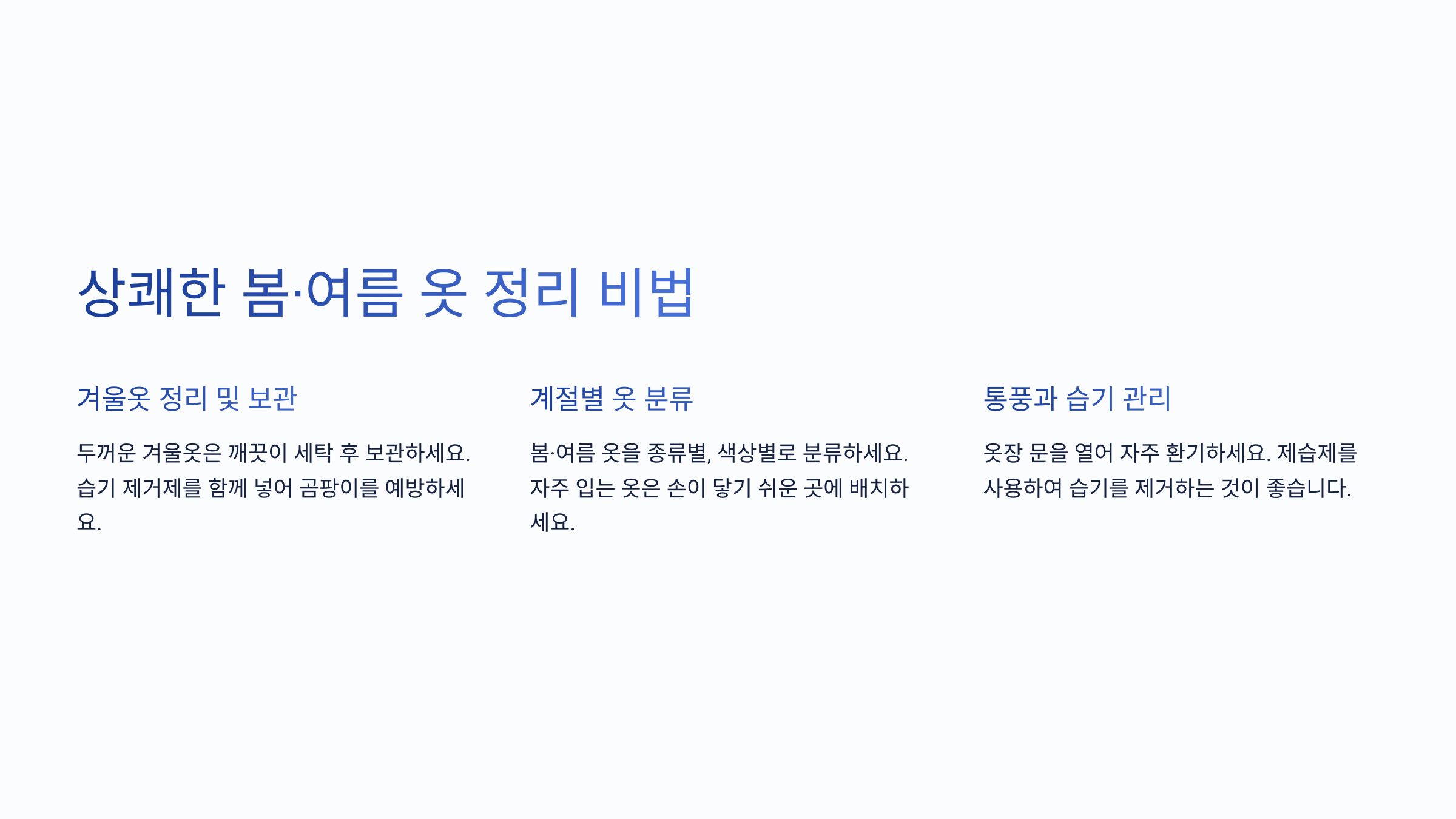 | 봄·여름 | 반팔, 얇은 셔츠, 린넨 옷 | 걸어두기 + 옷걸이 정리 |