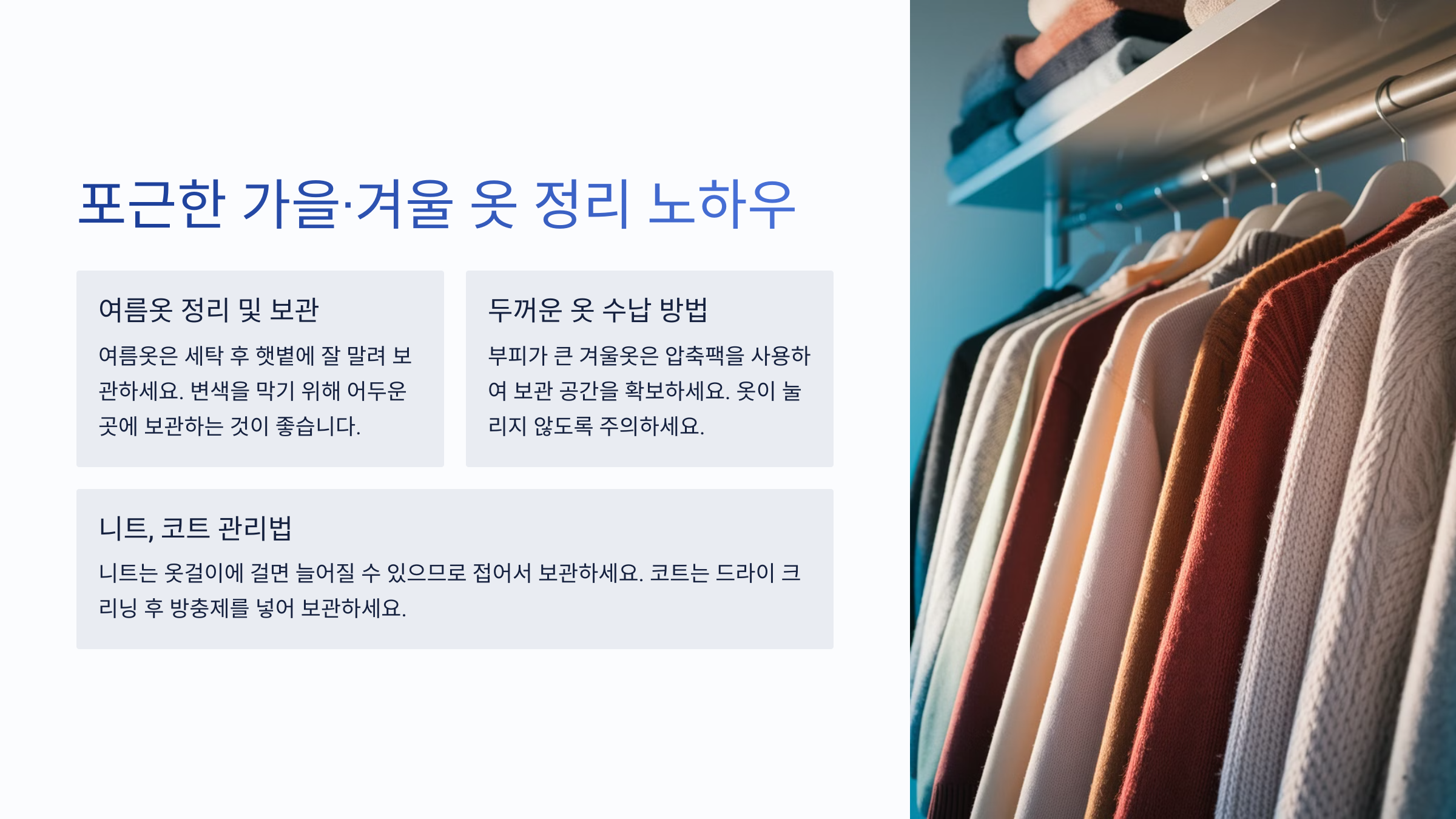 가을과 겨울 옷은 부피가 크기 때문에 보관 공간을 효율적으로 활용하는 것이 중요해요. 🏔️